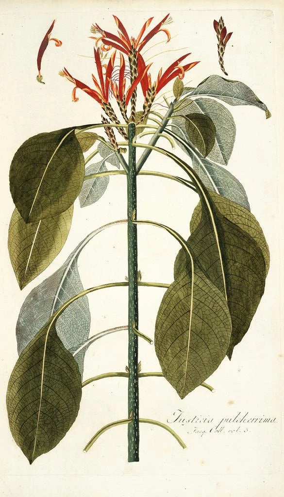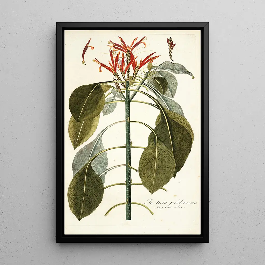 La impresión artística de Justicia pulcherrima nos sumerge en un universo vibrante donde la naturaleza se expresa con brillo. Los pétalos en tonos rojo vivo y matices anaranjados se destacan sobre un fondo verde, creando un contraste impactante. La técnica de acuarela, utilizada por Nikolaus Joseph Freiherr von Jacquin, permite capturar la delicadeza de las flores mientras ofrece una luminosidad excepcional. La atmósfera que emana de esta obra evoca el calor de los trópicos e invita a la contemplación de la belleza natural.