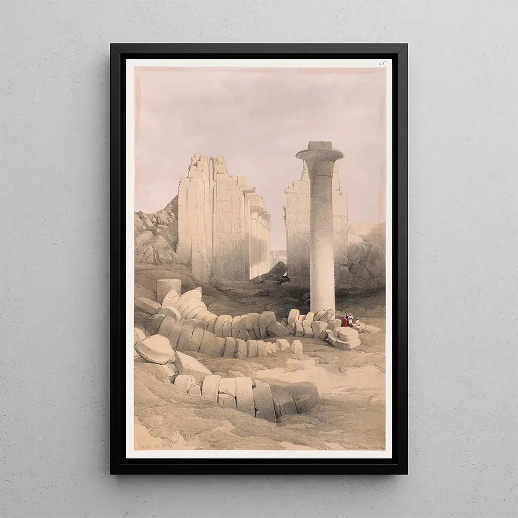 La impresión artística de Karnak 29 novembre 1838 nos sumerge en el corazón de los majestuosos templos egipcios. David Roberts, con su dominio del detalle, captura la inmensidad de las columnas y la luz dorada que acaricia las piedras antiguas. Los colores cálidos, que combinan ocres y azules profundos, evocan una atmósfera mística, casi sagrada. Cada elemento del lienzo parece contar una historia, la de una civilización que desafió al tiempo. La obra invita a la contemplación, a la evasión hacia un mundo donde la historia y la belleza se encuentran.