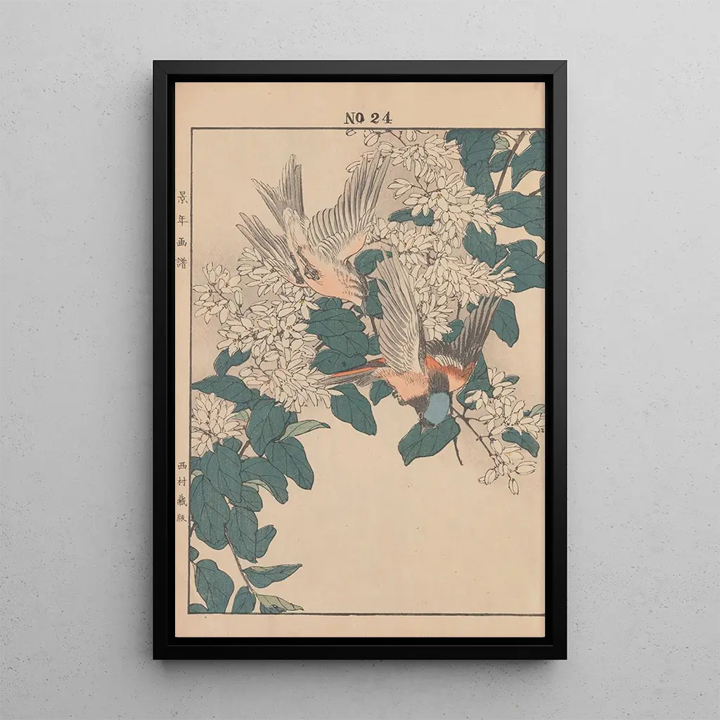 Imao Keinen, activo durante el período Meiji, es una figura emblemática de la impresión artística japonesa. Su capacidad para fusionar las técnicas tradicionales con influencias contemporáneas marcó su época. Keinen supo capturar la esencia de la naturaleza a través de sus obras, respondiendo a un público cada vez más ansioso de novedades. Sus composiciones florales, a menudo inspiradas por las estaciones, reflejan su profundo respeto por la belleza natural y su deseo de compartirla con el mundo. Su legado perdura, convirtiéndolo en un artista imprescindible en la historia del arte japonés.