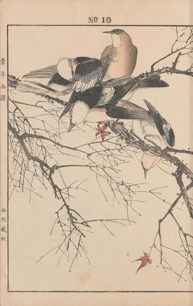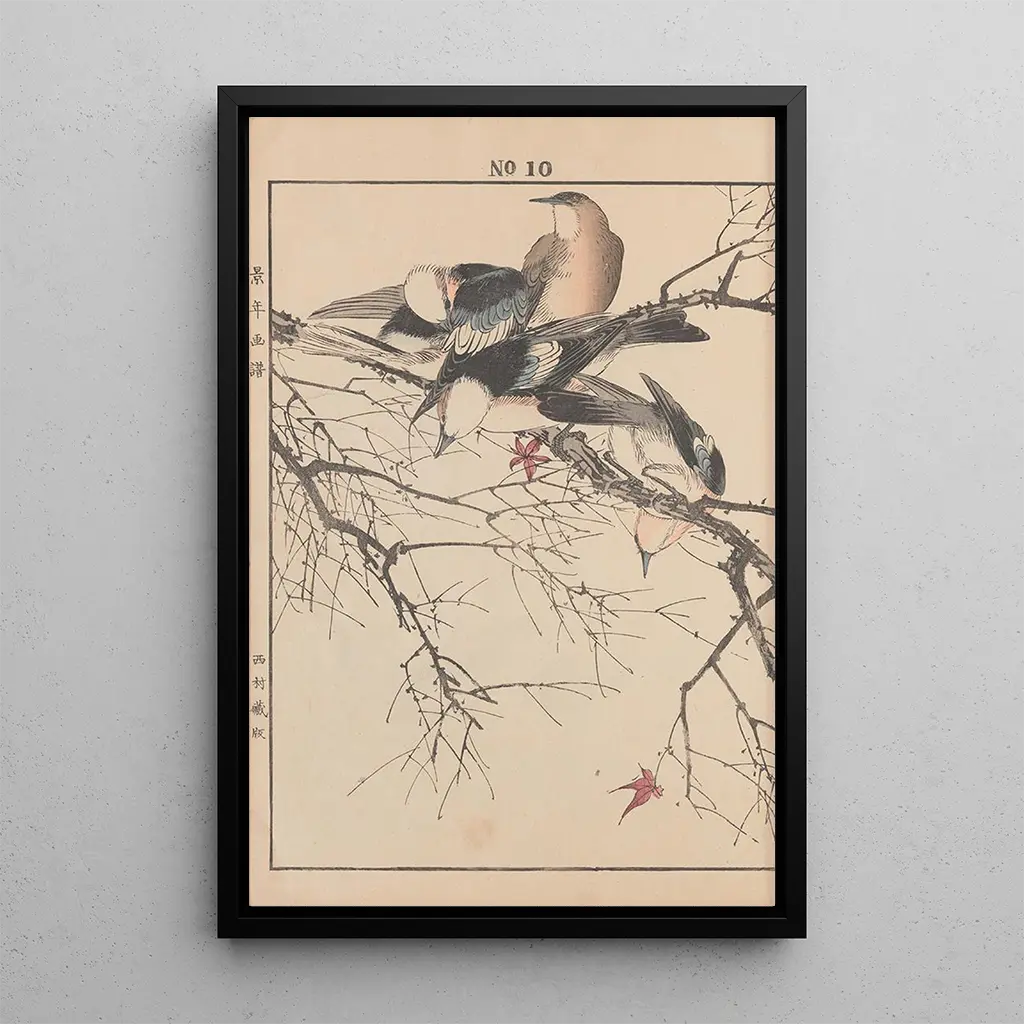 En la impresión artística Keinen kach gafu Pl133, el artista Imao Keinen nos transporta al corazón de un paisaje lleno de serenidad. Las delicadas tonalidades de verde y azul se combinan armoniosamente, creando una atmósfera relajante. La técnica de la estampa sobre papel, típica de la época Edo, revela una atención minuciosa a los detalles. Cada elemento, desde las hojas hasta las flores, parece vibrar bajo la luz suave, invitando al espectador a una contemplación meditativa. Este cuadro, un verdadero homenaje a la belleza efímera de la naturaleza, evoca un sentimiento de paz interior y evasión.