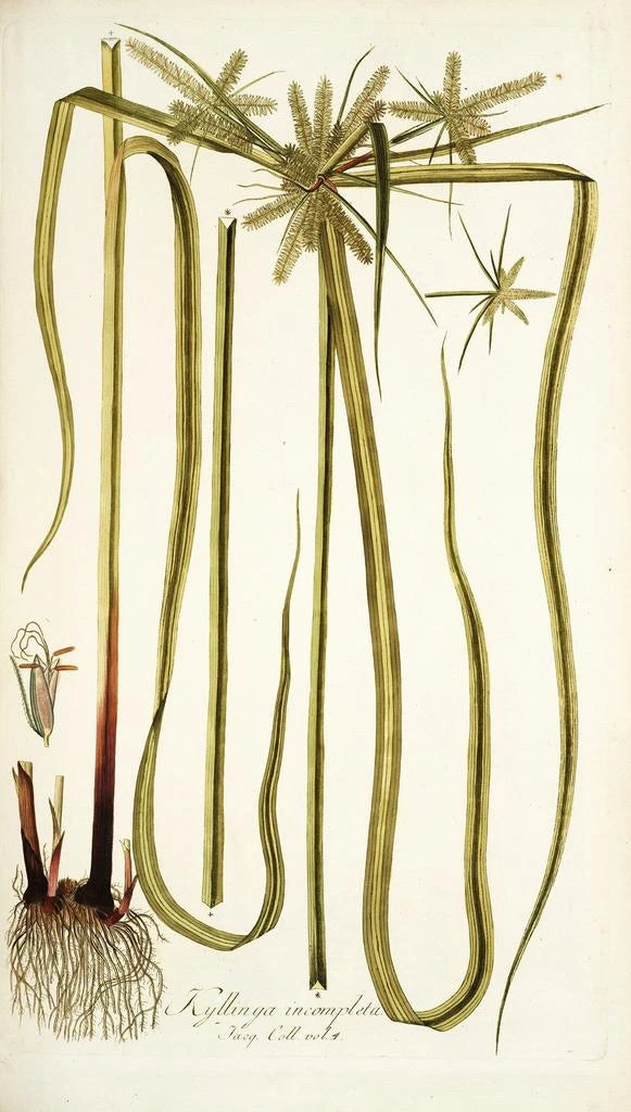 Kylinga incompleta, obra emblemática de Nikolaus Joseph Freiherr von Jacquin, captura la esencia misma de la flora exótica con una delicadeza inigualable. Los colores vibrantes de esta impresión artística evocan la riqueza de los paisajes tropicales, donde cada detalle está minuciosamente representado. La técnica de acuarela, utilizada por Jacquin, confiere a la obra una ligereza y fluidez, permitiendo que las formas orgánicas prosperen sobre el papel. La atmósfera que emana de esta obra es a la vez serena y fascinante, invitando al espectador a sumergirse en un mundo vegetal exuberante.
