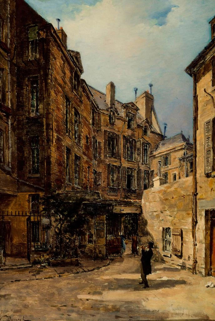 Paul-Joseph-Victor Dargaud, pintor francés del siglo XIX, es reconocido por su capacidad para capturar la esencia de la vida cotidiana en París. Influenciado por el movimiento realista, se esfuerza en representar escenas auténticas, lejos de las idealizaciones románticas. Dargaud supo imponerse en el medio artístico de su época, exhibiendo sus obras en el Salón de París. Su estilo, caracterizado por un cuidado en los detalles y una paleta rica, refleja una época en la que la urbanización y los cambios sociales moldeaban la sociedad francesa. La Cour de Rohan es uno de sus ejemplos más emblemáticos, ilustrando su talento para inmortalizar momentos fugaces.