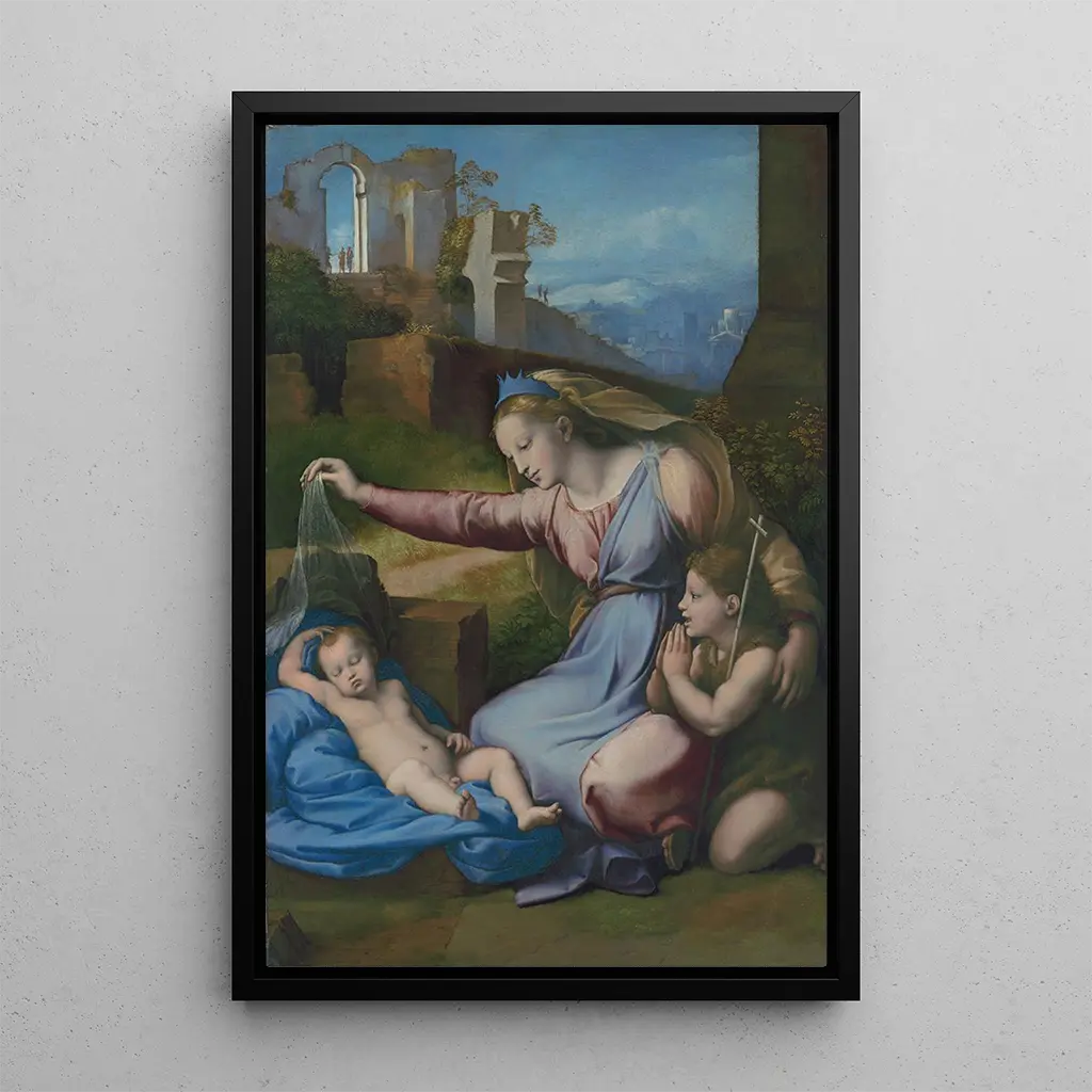 La Madona con diadema azul, obra emblemática de Rafael, es una representación sublime de la Virgen María, coronada con una belleza celestial. Los tonos de azul profundo y oro que adornan el diadema contrastan delicadamente con los tonos cálidos de la piel, creando una atmósfera a la vez majestuosa e íntima. La postura de la Virgen, sosteniendo con ternura al Niño Jesús, evoca una conexión espiritual y humana, mientras que los detalles refinados de los pliegues y los rostros añaden una dimensión de profundidad emocional a esta obra. Esta impresión artística encarna la armonía y la paz, características del estilo de Rafael.