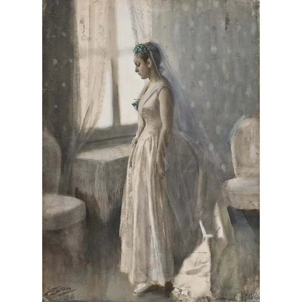 "La novia" de Anders Zorn es una obra que captura la belleza atemporal de una mujer en este día excepcional. La tela se distingue por sus colores vibrantes y su iluminación sutil, que resaltan los detalles refinados del vestido de novia. Zorn utiliza una técnica de pintura al óleo que da vida a la textura de las telas y a la expresión delicada del rostro de la novia. La atmósfera general de la composición evoca una celebración del amor y la alegría, invitando al espectador a sentir la emoción de este momento único.