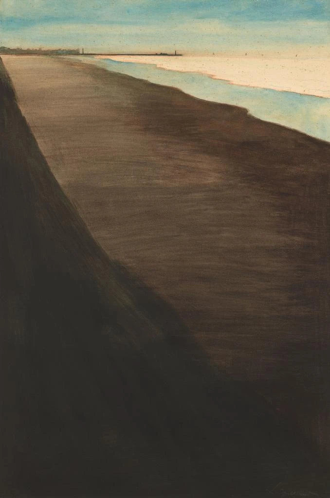 "La plage" de Léon Spilliaert es una obra que captura la belleza salvaje y la inmensidad del mar. En esta obra, las olas rompen en la orilla, mientras que el cielo se tiñe de colores vibrantes, que van desde el azul profundo hasta los matices dorados de la puesta de sol. La técnica de Spilliaert, con sus pinceladas fluidas y expresivas, crea una dinámica entre el agua y el cielo, evocando una sensación de movimiento y libertad. Las figuras humanas, a menudo solitarias, añaden una dimensión introspectiva a esta escena marítima, invitando al espectador a reflexionar sobre su propio lugar en el universo.