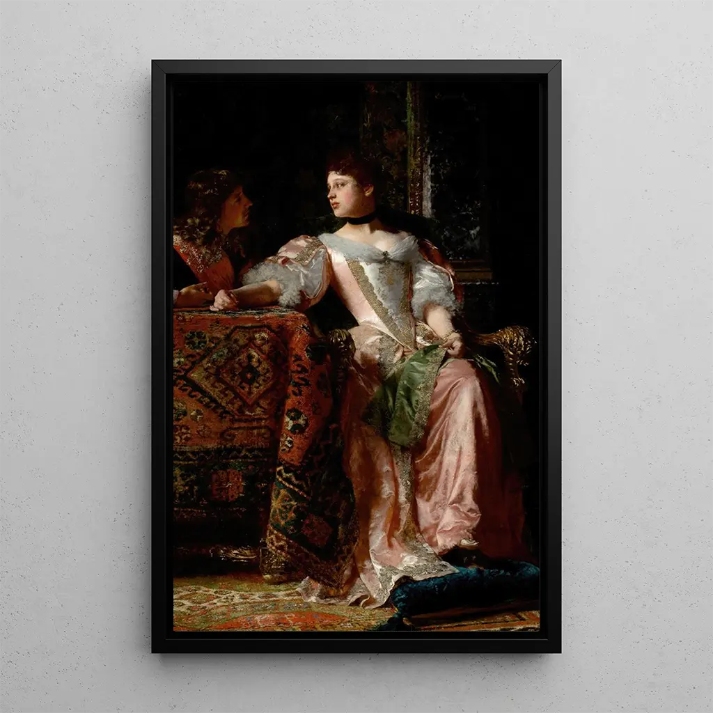 La impresión artística de La Proposition de Władysław Czachórski nos sumerge en una atmósfera íntima y cargada de emoción. Este lienzo evoca un momento suspendido, donde un hombre, con una mirada llena de pasión, se dirige a una mujer con rostro dulce y soñador. Los colores cálidos, dominados por tonos tierra y toques de luz dorada, crean un ambiente romántico. La técnica de Czachórski, combinando realismo y delicadeza, permite captar los detalles de las expresiones y los gestos, haciendo que la escena sea viva y conmovedora. La obra invita a la contemplación, a cuestionarse sobre los sentimientos que animan a los personajes.