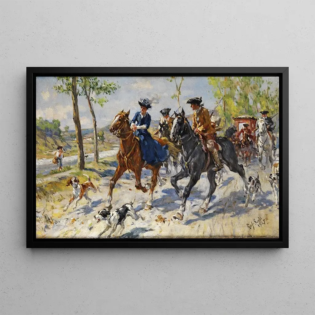 "La salida a caballo" de Raffaello Sorbi captura un instante fugaz donde la elegancia y el movimiento se encuentran. Esta impresión artística representa una escena vibrante, donde jinetes, vestidos con trajes refinados, se preparan para abandonar un entorno bucólico. Los colores vivos y los detalles minuciosos de la vestimenta contrastan con la suavidad de los paisajes circundantes, creando una atmósfera dinámica y alegre. Sorbi, maestro del movimiento, logra transmitir una sensación de ligereza y libertad, invitando al espectador a sentir la emoción de esta salida. Cada personaje parece estar animado por una historia, haciendo la obra aún más cautivadora.