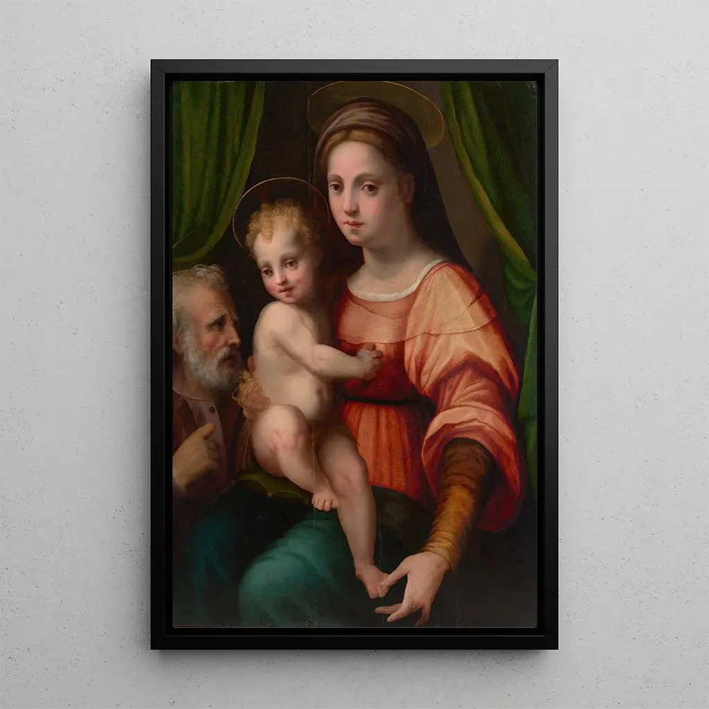 La impresión artística de La Sainte Famille evoca una atmósfera de serenidad y protección. Las figuras de María, José y el Niño Jesús están representadas con una ternura palpable, sus expresiones suaves y benevolentes. Los colores cálidos, dominados por tonos ocre y dorados, crean un ambiente acogedor, mientras que la luz parece emanar de la escena misma, iluminando los rostros de los personajes. La técnica de Domenico Puligo, que combina claroscuro y detalles minuciosos, da vida a esta obra, invitando al espectador a contemplar la belleza de la vida familiar sagrada.