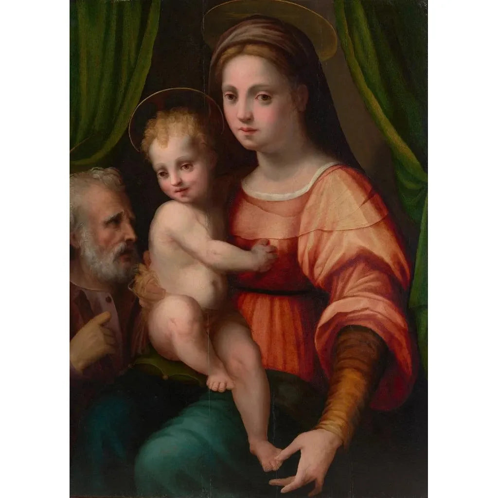 Domenico Puligo, activo en el siglo XVI, es un artista del Renacimiento italiano cuyo trabajo refleja las influencias de sus contemporáneos, especialmente Miguel Ángel y Rafael. Desarrollándose en el contexto florentino, supo combinar tradición e innovación, creando obras que testimonian la riqueza espiritual de su época. Aunque menos conocido que algunos de sus pares, Puligo dejó su huella con composiciones armoniosas y representaciones conmovedoras de la vida religiosa. La Sainte Famille es un ejemplo emblemático de su estilo, ilustrando su talento para capturar la emoción y la devoción.