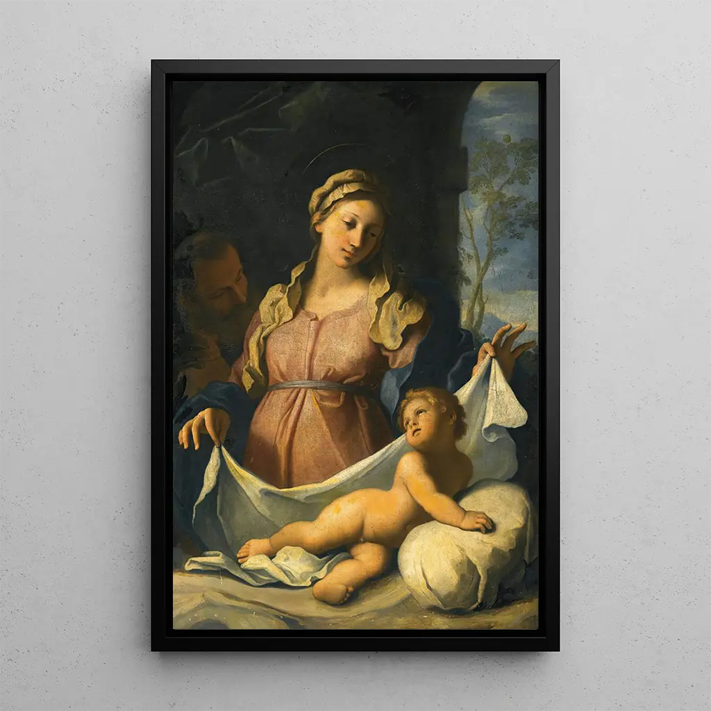 La impresión artística de La Santa Familia de Gian Domenico Cerrini transmite una atmósfera de serenidad y devoción. Los personajes, dispuestos con delicadeza, están bañados en una luz suave que resalta las tonalidades cálidas de los colores. La técnica de Cerrini, combinando claroscuro y una atención minuciosa a los detalles, crea una profundidad emocional. Las expresiones de los rostros, llenas de ternura, invitan a una contemplación silenciosa, mientras que los pliegues de las ropas añaden una dimensión táctil a la obra. Este lienzo, verdadera oda a la familia sagrada, evoca sentimientos de paz y protección.