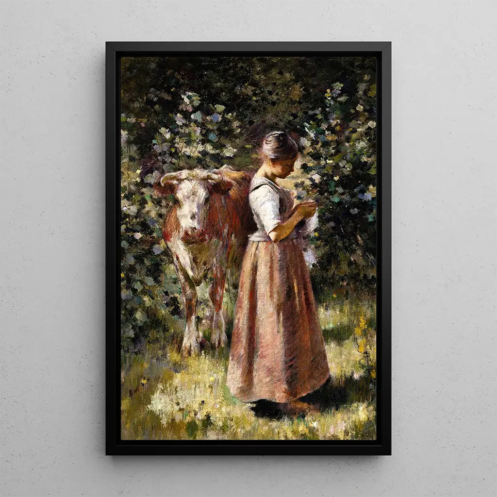 En "La vachère", Theodore Robinson captura la esencia de una escena bucólica impregnada de serenidad. La composición destaca a una joven, vestida con un vestido sencillo, que cuida de una vaca en un paisaje verde. Los colores suaves y naturales, que van desde verdes brillantes hasta marrones cálidos, crean una atmósfera relajante. La técnica impresionista de Robinson, caracterizada por pinceladas fluidas y una luz sutil, da vida a esta escena cotidiana, invitando al espectador a sentir la tranquilidad del campo. Esta obra evoca no solo la belleza de la naturaleza, sino también la sencillez y la armonía de la vida rural.