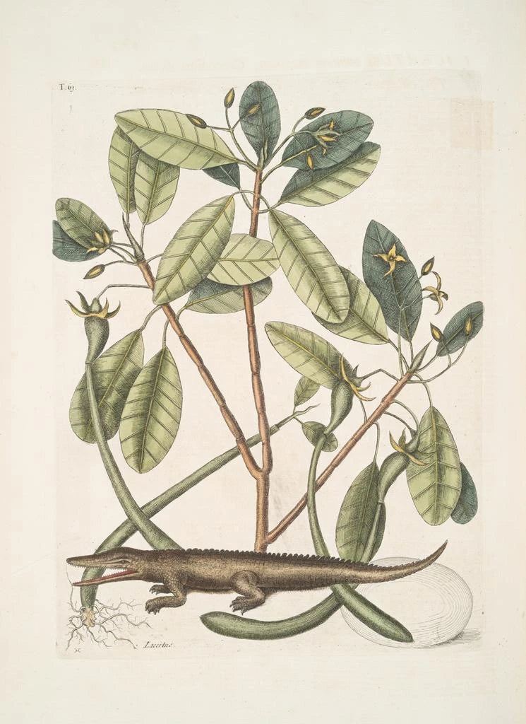 Mark Catesby, activo en el siglo XVIII, es considerado uno de los primeros naturalistas en documentar la fauna y la flora americanas. Sus viajes por las colonias dieron lugar a obras que combinan arte y ciencia, ofreciendo una visión valiosa de la biodiversidad de la época. Influenciado por el movimiento barroco, su estilo se distingue por un cuidado en los detalles y un enfoque realista. "Lacertus L'alligator" refleja su compromiso de representar fielmente las especies que observaba, contribuyendo así al conocimiento científico y a la apreciación artística de la naturaleza.