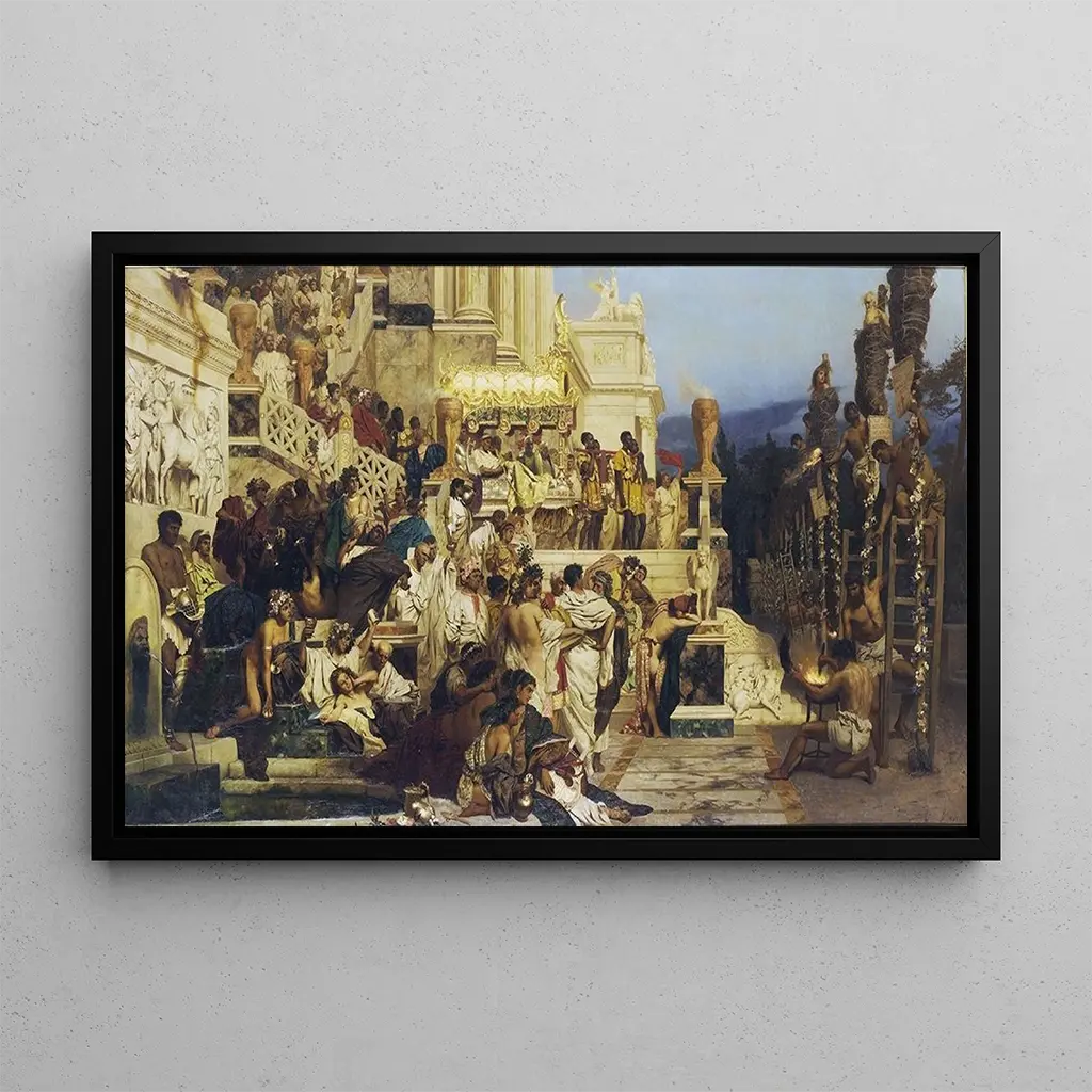 Henryk Siemiradzki, pintor polaco del siglo XIX, es famoso por sus obras de impresión artística que combinan rigor académico y sensibilidad artística. Formado en la Academia de Bellas Artes de San Petersburgo, fue influenciado por los maestros del Renacimiento y del Barroco, lo que se refleja en su estilo elaborado. Siemiradzki supo capturar momentos históricos con una precisión notable, rindiendo homenaje a la grandeza de la antigüedad. "Les Torches de Néron" ilustra perfectamente su habilidad para fusionar historia y arte, explorando temas universales como la pasión y el poder.