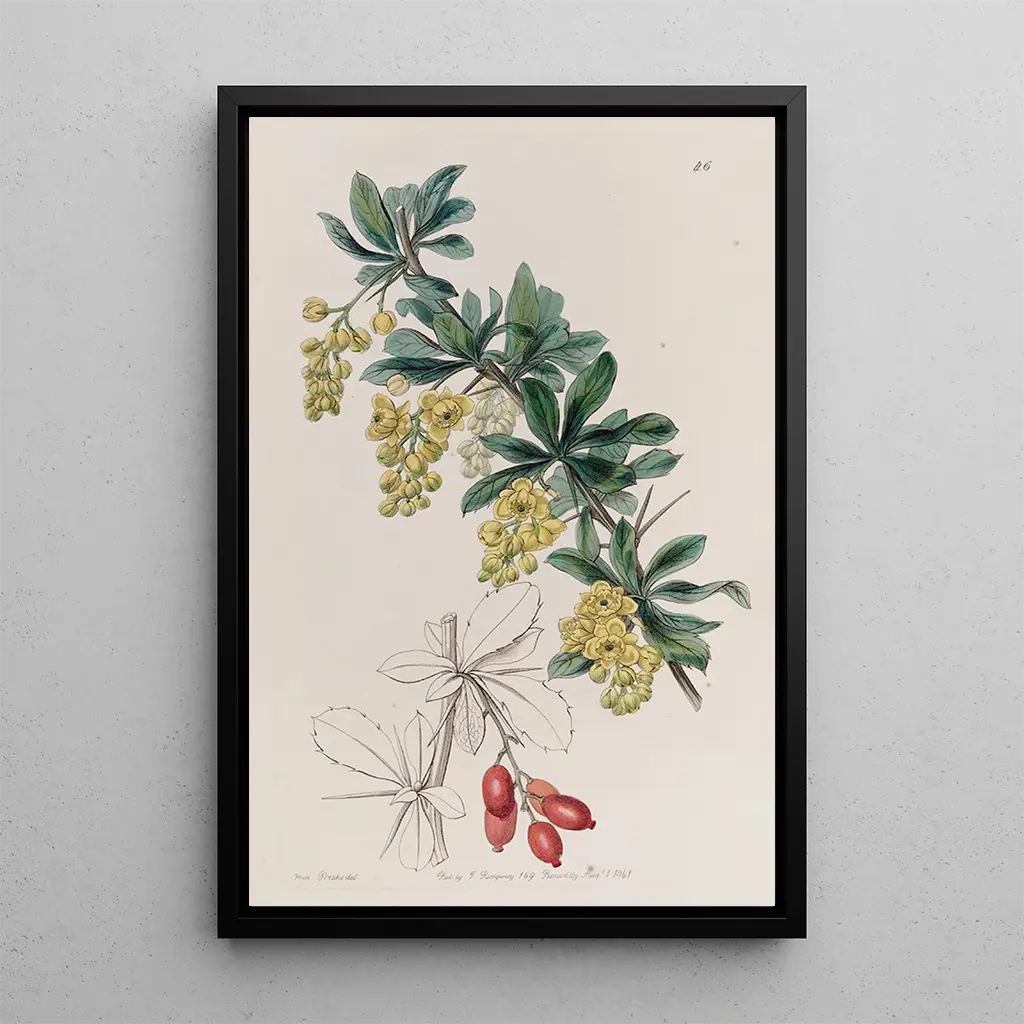 La impresión artística "L'Épine-Vinette des Tanneurs" de Sydenham Edwards se distingue por su representación delicada y detallada de esta planta resistente. Los tonos ricos de verde y amarillo, acentuados por toques de rojo, crean un cuadro vivo que evoca la fuerza de la naturaleza. La técnica de acuarela utilizada por Edwards permite capturar la textura de las hojas y la forma de las bayas, haciendo que la obra sea a la vez realista y poética. La atmósfera que emana de este lienzo está impregnada de serenidad, invitando al espectador a apreciar la belleza de los elementos a menudo pasados por alto del mundo natural.