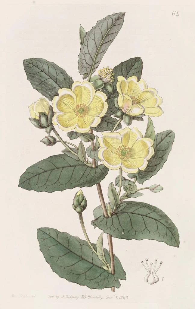 L'hibbertia Thoroughwax, con sus pétalos brillantes y su estructura delicada, es una obra que celebra la belleza de las flores. Sydenham Edwards, a través de su dominio de la acuarela, logra capturar la luz y la textura de esta planta única. Las tonalidades de amarillo y verde se mezclan para crear una composición armoniosa, invitando al espectador a sumergirse en un mundo floral vibrante. Cada detalle está cuidadosamente representado, ofreciendo una atmósfera a la vez relajante e inspiradora, como un paseo por un jardín exuberante.