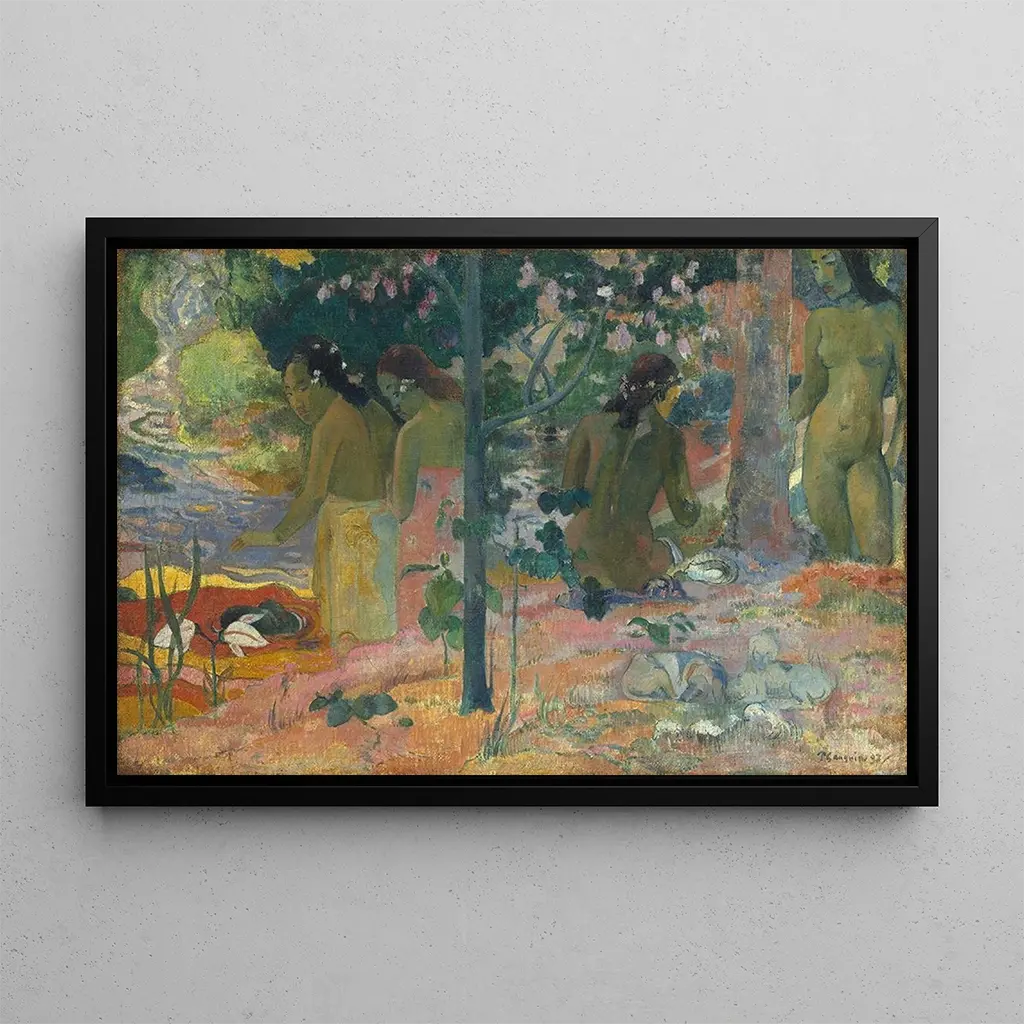 En esta obra vibrante, Paul Gauguin nos sumerge en un universo donde la naturaleza y la humanidad se encuentran en perfecta armonía. Los bañistas, bañados por la luz, se relajan junto al agua, rodeados de paisajes exuberantes. Los colores cálidos y saturados, típicos del estilo postimpresionista, evocan una atmósfera de serenidad y alegría. La técnica del toque amplio y expresivo de Gauguin da vida a cada personaje, creando una escena a la vez dinámica y tranquila. Este lienzo invita a la contemplación y a la evasión, una verdadera impresión artística de vida donde el tiempo parece suspendido.