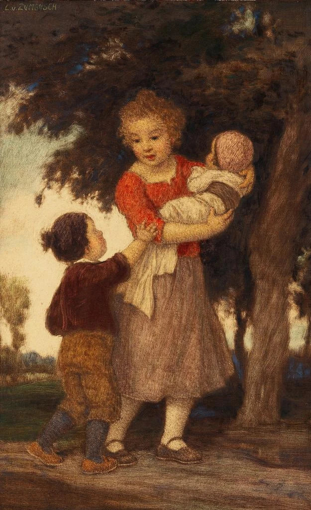 En "Los tres hermanos y hermanas", Ludwig von Zumbusch presenta una escena conmovedora que evoca la complicidad y el amor fraternal. La composición destaca a los tres niños, capturados en un momento de juego y alegría, rodeados de una naturaleza exuberante que añade una dimensión vibrante a la obra. Los colores vivos y los detalles minuciosos, típicos del estilo de Zumbusch, crean una atmósfera cálida y acogedora. Cada rostro expresa una emoción sincera, haciendo de esta obra no solo un retrato familiar, sino también una celebración de la infancia y de los lazos que unen a los seres.
