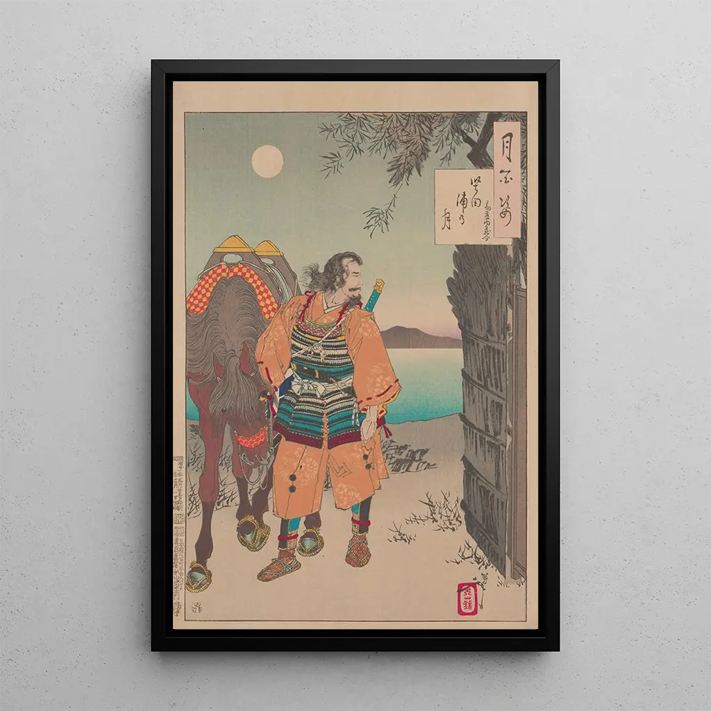 En esta obra cautivadora, Tsukioka Yoshitoshi nos transporta al corazón de una noche tranquila, donde la luna ilumina delicadamente la bahía de Katada. Las tonalidades de azul y negro se combinan armoniosamente, creando una atmósfera a la vez misteriosa y relajante. La técnica del grabado en madera, característica del ukiyo-e, permite representar los detalles con una precisión notable, desde los reflejos de la luna en el agua hasta las siluetas de las montañas en el fondo. Cada elemento de la composición invita a la contemplación, a la evasión hacia un mundo donde el tiempo parece suspendido.