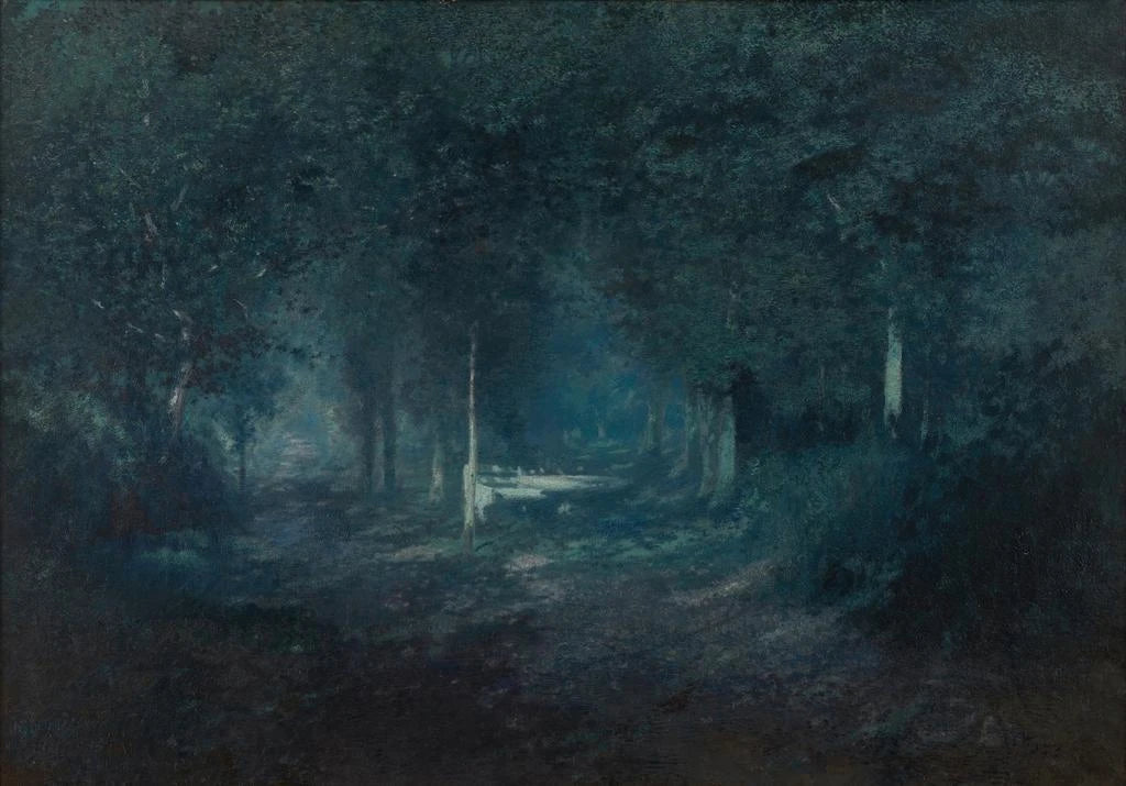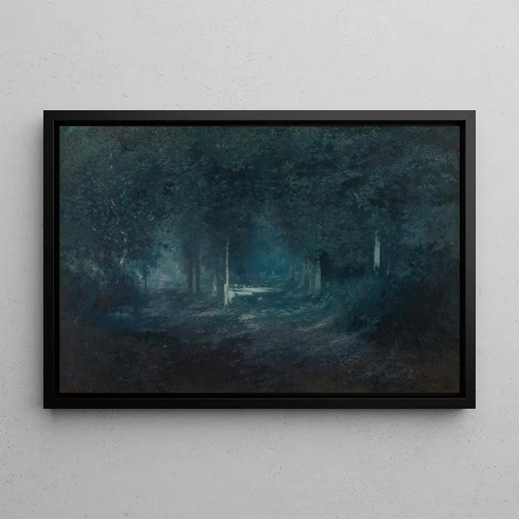 Bois au clair de lune, una obra de Adrien Joseph Heymans, evoca una escena nocturna llena de misterio y poesía. La tela representa un paisaje forestal bañado por la luz plateada de la luna, donde los árboles se alzan majestuosamente. Las tonalidades de azul y negro se mezclan sutilmente, creando una atmósfera a la vez tranquila y envolvente. La técnica de Heymans, con sus trazos de pincel fluidos y su dominio de la luz, da vida a esta escena nocturna, invitando al espectador a explorar las profundidades del bosque. Cada detalle, desde las hojas brillantes hasta las sombras danzantes, contribuye a una atmósfera mágica y contemplativa.