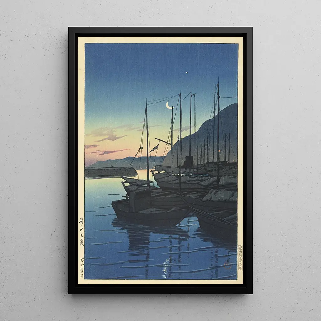 El cuadro Matin à Beppu de Kawase Hasui evoca una atmósfera pacífica y contemplativa. Los tonos suaves de azul y verde se mezclan armoniosamente, creando una sensación de tranquilidad. La técnica de la impresión artística en madera, característica del arte japonés, permite capturar la luz sutil de la mañana, mientras que los detalles delicados de los paisajes y los edificios invitan a una inmersión total. Esta obra transporta al espectador a un momento suspendido, donde la naturaleza y la arquitectura se encuentran con gracia.