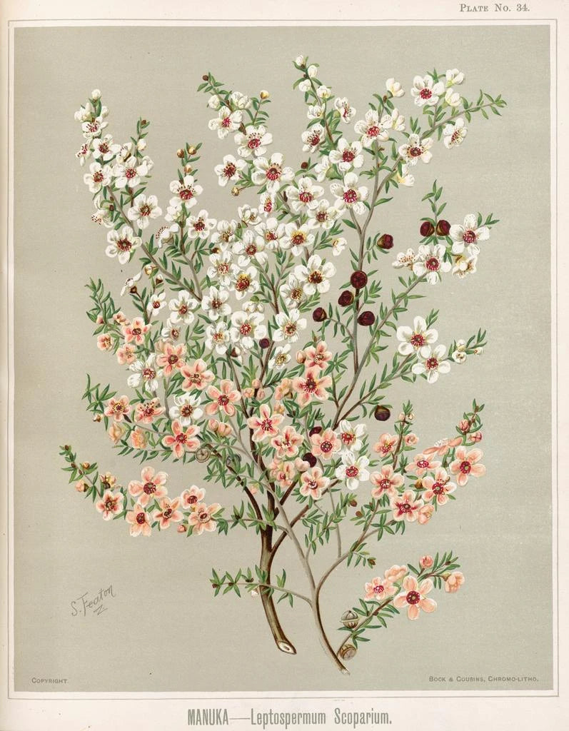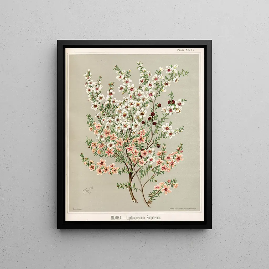 En 'Manuka Leptospermum scoparium', Sarah Featon ilustra con maestría esta planta, ampliamente reconocida por sus propiedades medicinales y su importancia en la cultura māori. Featon, como artista botánico del siglo XIX, supo combinar precisión científica y sensibilidad artística, creando obras que van más allá de una simple ilustración. La belleza del manuka, con sus flores delicadas y sus hojas aromáticas, se captura con una minuciosidad que atrae la vista y estimula la imaginación. Esta obra no solo celebra la biodiversidad neozelandesa, sino que también invita a explorar los vínculos entre la naturaleza y la cultura. En un entorno contemporáneo, esta pieza puede aportar un toque de autenticidad y serenidad. La impresión artística de esta ilustración está disponible en Artem Legrand.