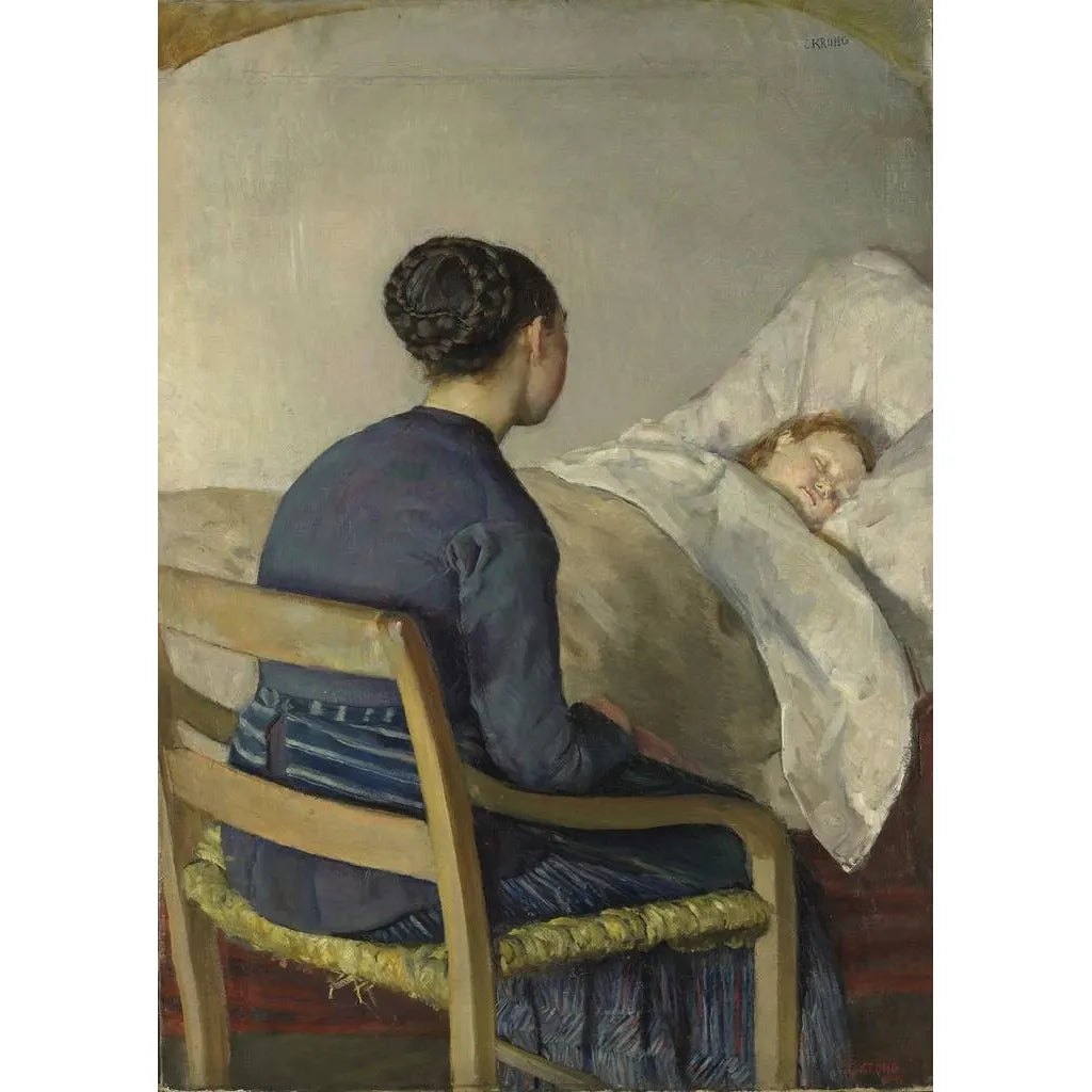 Dans "Mère au chevet de son enfant", Christian Krohg captura un moment de dévotion maternelle avec une délicatesse poignante. La scène, baignée dans une lumière douce, met en avant la silhouette protectrice de la mère, dont l’expression trahit à la fois l’inquiétude et l’amour inconditionnel. Les couleurs pastel, mêlant des nuances de bleu et de rose, créent une atmosphère apaisante et réconfortante. La technique de Krohg, qui allie réalisme et sensibilité, permet de ressentir la profondeur de ce lien unique entre la mère et son enfant, transformant cette toile en une véritable ode à la maternité.