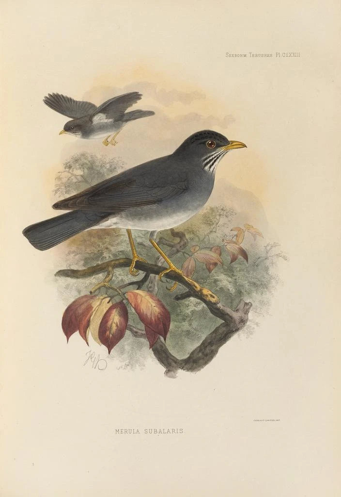 Henry Seebohm, naturalista y artista del siglo XIX, supo fusionar su amor por la naturaleza con su talento artístico. Influenciado por los descubrimientos científicos de su época, dedicó su vida al estudio de las aves, convirtiéndose en una figura emblemática en el campo de la ornitología. Sus obras, como Merula Subalaris, testimonian su atención al detalle y su deseo de transmitir la belleza del mundo animal. A través de sus cuadros, Seebohm no solo documentó la fauna, sino que también contribuyó a sensibilizar al público sobre la conservación de la naturaleza.