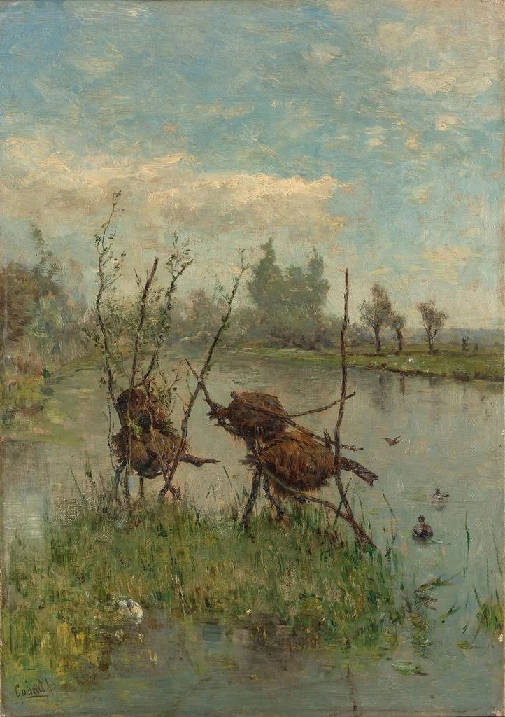 En "Nidos de patos", Paul Joseph Constantin Gabriël nos transporta al corazón de un paisaje bucólico donde la suavidad de la luz se mezcla con la tranquilidad de la escena. La tela representa un momento fugaz, capturando la esencia de la naturaleza con colores suaves y matices delicados. Los patos, tranquilamente instalados en su nido, están rodeados de una vegetación exuberante que evoca una atmósfera serena y contemplativa. La técnica impresionista de Gabriël, con sus trazos de pincel fluidos, confiere a la obra una sensación de movimiento y vida, invitando al espectador a sumergirse en este cuadro encantador.