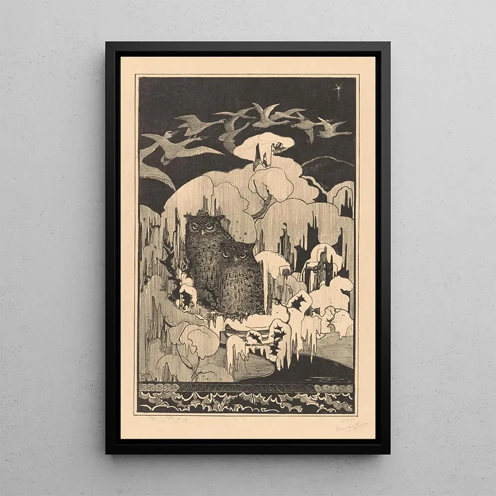 La impresión artística de "Nuit de Noël" de Theo van Hoytema évoque une atmosphère paisible et féerique. Les teintes sombres du ciel étoilé se mêlent à des éclats de lumière douce, créant un contraste captivant. La technique de l’artiste, qui combine aquarelle et huile, donne vie à une scène où la nature et l’architecture s’entrelacent harmonieusement. Les silhouettes des arbres et des maisons, délicatement éclairées, invitent à la contemplation et à la rêverie, faisant de cette toile un véritable poème visuel sur la magie des nuits d’hiver.