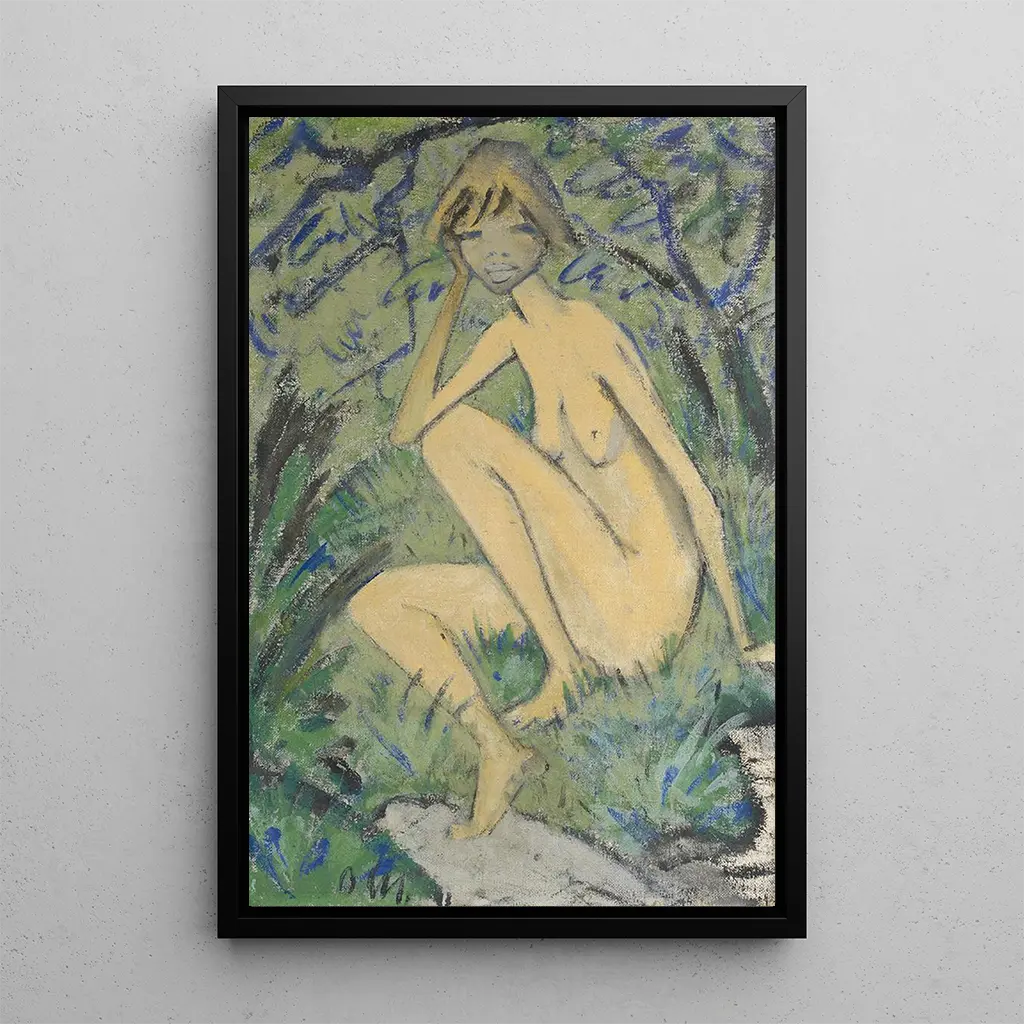 La impresión artística Nu sentado en el paisaje de Otto Mueller es una celebración de la belleza del cuerpo humano en symbiose con la naturaleza. La composición destaca una figura femenina, delicadamente posada en un entorno natural, donde los colores suaves y las formas orgánicas se unen. Las tonalidades de verde y tierra evocan una sensación de serenidad, mientras que la postura del modelo sugiere a la vez vulnerabilidad y fuerza. Esta obra transmite una atmósfera tranquila, casi meditativa, invitando al espectador a sumergirse en este momento suspendido entre el hombre y su entorno.