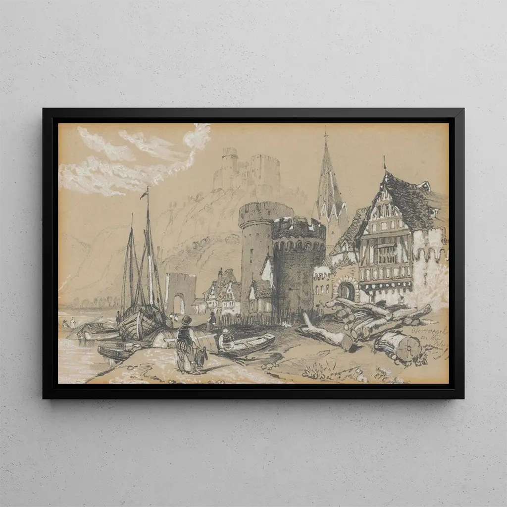 « Oberwesel », obra emblemática de Edward Theodore Compton, nos transporta al corazón de un paisaje romántico donde la naturaleza majestuosa encuentra la arquitectura histórica. Este cuadro representa una vista panorámica de la ciudad de Oberwesel, con sus casas pintorescas y sus colinas verdes. Los colores vivos y los contrastes impactantes crean una atmósfera dinámica, mientras que la luz natural ilumina los detalles arquitectónicos. La técnica de Compton, que combina realismo e impresionismo, permite sentir la profundidad y la textura del paisaje, haciendo que esta impresión artística sea especialmente cautivadora para los amantes del arte.