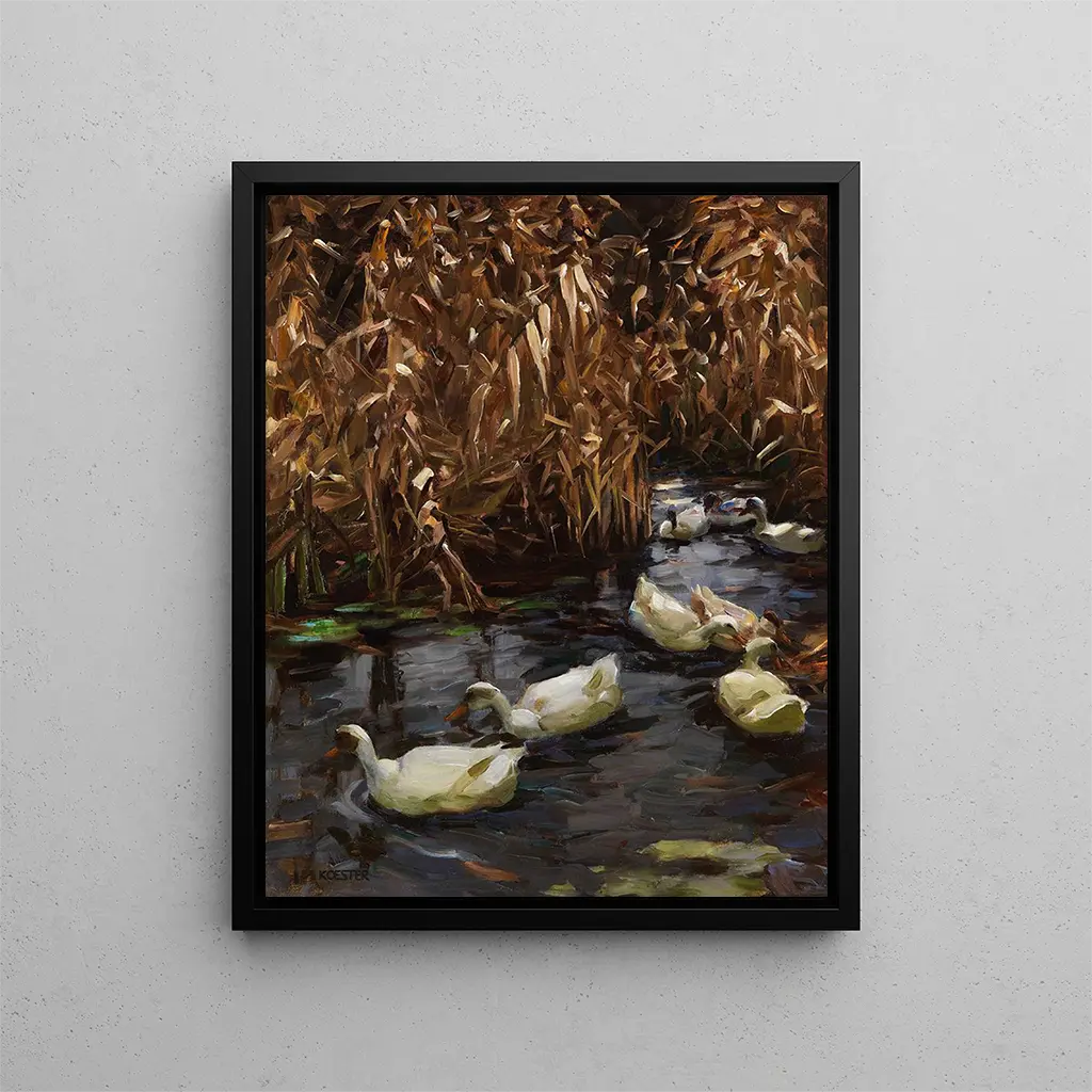Reproducción Huit patos en los juncos de otoño - Alexander Koester – Introducción cautivadora En el universo rico y fascinante del arte animalista, la obra "Huit canards dans les roseaux d'automne - Alexander Koester" se distingue por su capacidad para capturar la esencia misma de la naturaleza. Este cuadro, que evoca una escena tranquila y armoniosa, invita al espectador a sumergirse en un momento suspendido donde la belleza de los patos, rodeados de juncos dorados, se entrelaza con las tonalidades cálidas del otoño. Koester, maestro en el arte de la representación animal, logra crear una atmósfera de intimidad y serenidad, una verdadera oda a la fauna salvaje que nos rodea. A través de esta obra, los espectadores son transportados a un mundo donde el tiempo parece detenerse, permitiendo una contemplación profunda y apacible. Estilo y singularidad de la obra La obra de Alexander Koester se caracteriza por un realismo impactante, donde cada detalle es cuidadosamente observado y reproducido. Las plumas de los patos, delicadamente representadas, revelan una paleta de colores ricos y variados, que van desde tonos terrosos hasta destellos irisados. Esta atención a los detalles, combinada con un dominio de la luz y la sombra, confiere a la escena una profundidad y una dimensión casi palpables. Los juncos, que enmarcan a los patos, añaden un toque de movimiento a todo el conjunto, como si una brisa ligera acariciara la superficie del agua. Este cuadro no se limita a representar una simple escena de la naturaleza; también evoca emociones, una tranquilidad mental y una conexión con el mundo natural. La composición armoniosa y equilibrada permite guiar la mirada del espectador a través de la obra, creando así una experiencia visual inmersiva. El artista y su influencia Alexander Koester, nacido en 1864 en Berlín, es reconocido como uno de los pioneros del arte animalista en la transición del siglo XX. Su pasión por la naturaleza y su fascinación por la fauna acuática lo llevaron a explorar ríos y lagos, donde pudo observar y estudiar los comportamientos de las aves. Influenciado por los grandes maestros del realismo, Koester supo desarrollar un estilo propio, combinando precisión técnica y sensibilidad