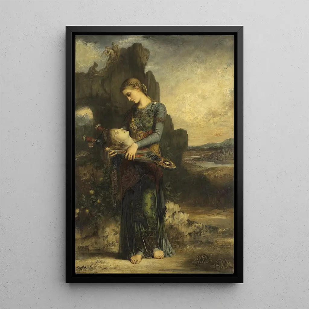 Gustave Moreau, nacido en 1826, es un artista emblemático del movimiento simbolista, cuya obra explora los temas de la mitología y de la imaginación. Su formación en la École des Beaux-Arts de París y sus viajes en Italia influyen profundamente en su estilo, que combina romanticismo y elementos decorativos. Moreau se distingue por su capacidad para transformar relatos mitológicos en cuadros poéticos, donde cada detalle tiene un significado. "Orphée" es una ilustración perfecta de este enfoque, donde la figura del músico se convierte en un símbolo del arte y de la trascendencia, al mismo tiempo que se inscribe en un contexto artístico rico en innovaciones.