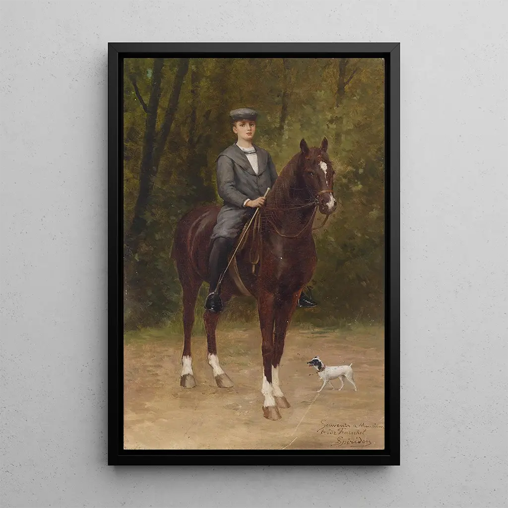 La impresión artística "Oskar von Fraenkel a caballo" de Ignace Spiridon captura un momento de gracia y potencia. La tela, rica en detalles, representa a un hombre con vestimenta de equitación, majestuosamente montado en un caballo galopando. Los colores cálidos, que combinan tonos marrón profundos y destellos dorados, infunden una atmósfera dinámica y vibrante. La técnica de Spiridon, que combina realismo y toques impresionistas, permite sentir el movimiento y la energía de la escena. Cada pincelada parece vibrar, evocando la pasión del jinete y la nobleza del animal.