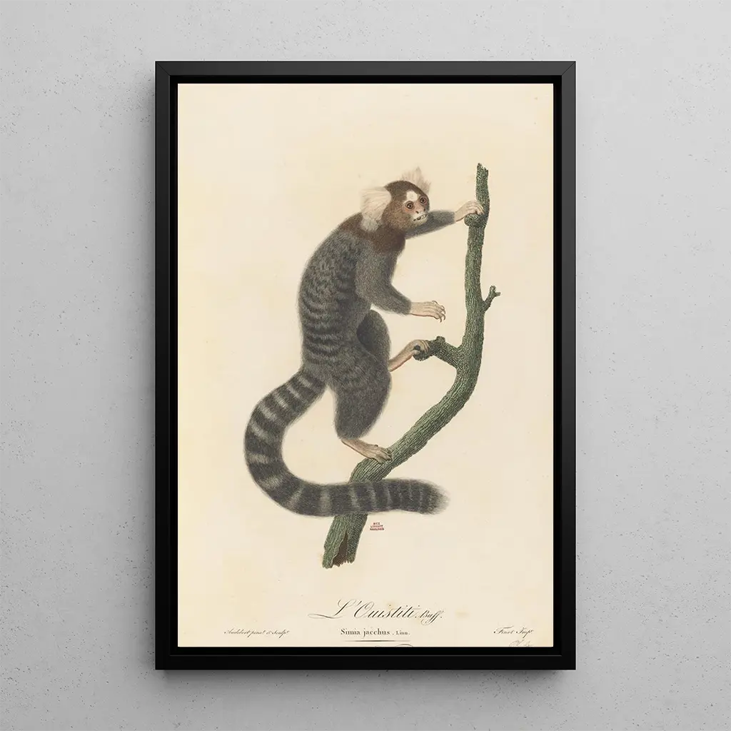 L'Ouistiti, obra emblemática de Jean-Baptiste Audebert, captura la atención por su realismo impactante y su expresividad. La composición destaca a este pequeño primate en una postura curiosa, rodeado de una vegetación exuberante. Los colores vivos y naturales, que van desde verdes profundos hasta marrones terrosos, crean una atmósfera vibrante y dinámica. Audebert, con su técnica minuciosa, logra transmitir la vivacidad del animal, haciendo casi palpable su carácter travieso. Esta impresión artística del cuadro L'Ouistiti invita a una inmersión en el mundo animal, celebrando además la belleza de la fauna.