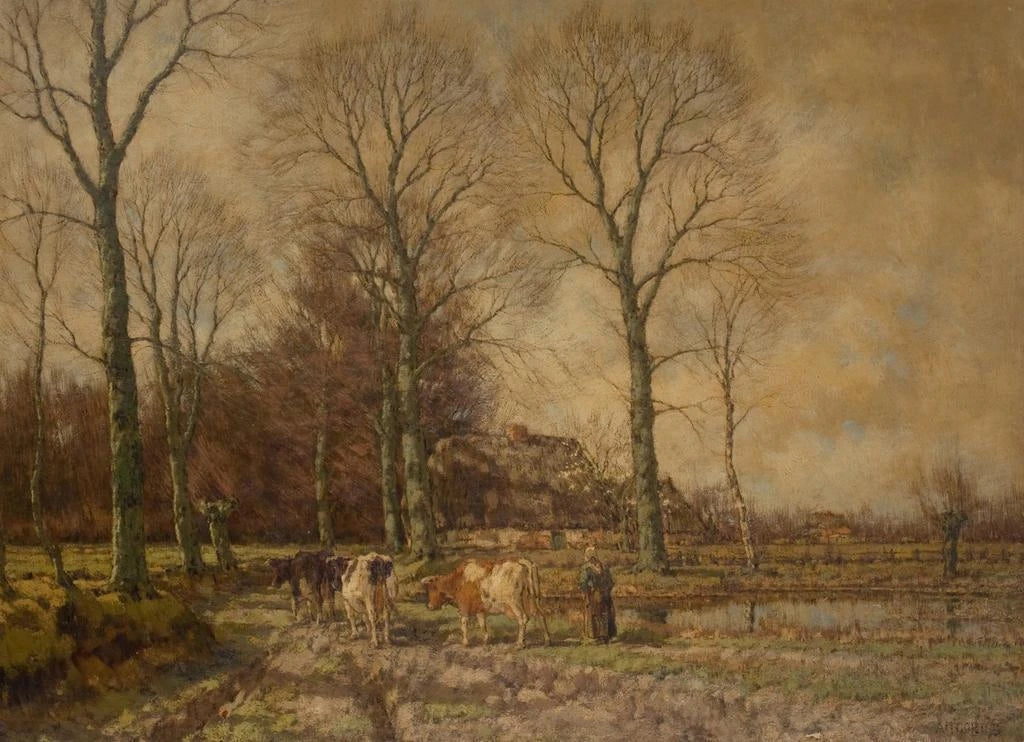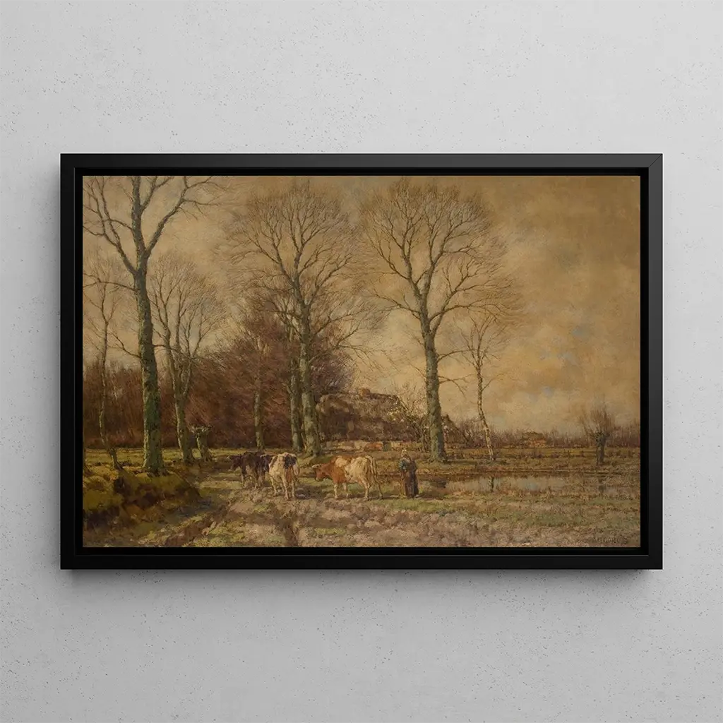 Arnold Marc Gorter, pintor neerlandés del siglo XIX, es reconocido por su capacidad para capturar la belleza de los paisajes de su país. Influenciado por el movimiento realista, se inscribe en una tradición artística que valora la representación fiel de la naturaleza. Gorter también fue influenciado por la escuela de La Haya, que promovía la observación directa de escenas de la vida cotidiana. Sus obras, a menudo impregnadas de luz y color, testimonian un profundo respeto por el entorno rural y la vida de los agricultores. Este cuadro, como muchos otros, ilustra su compromiso por inmortalizar la belleza de los paisajes neerlandeses.