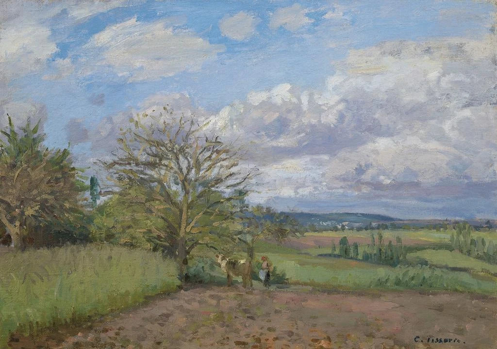 En esta impresión artística de "Paisaje con una vaca", Camille Pissarro nos transporta a un universo pastoral donde la naturaleza florece. La composición está dominada por tonos suaves de verde y azul, evocando la tranquilidad de una mañana en el campo. La técnica impresionista, caracterizada por trazos de pincel rápidos y toques de color yuxtapuestos, crea una atmósfera viva y dinámica. La vaca, ubicada en el centro del lienzo, parece alimentarse pacíficamente, mientras que el paisaje circundante, con sus árboles y su cielo luminoso, invita a la contemplación y a la ensoñación.