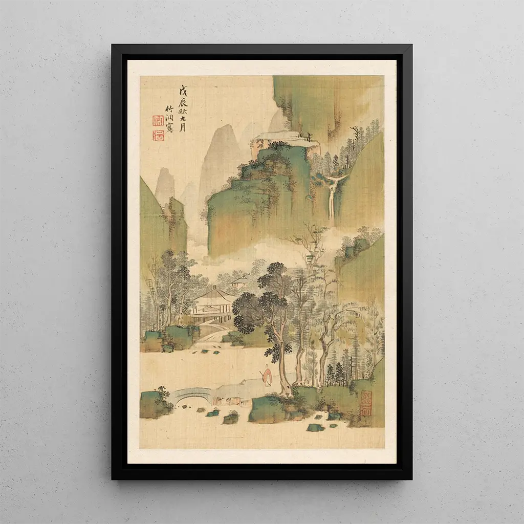 En esta impresión artística de la obra "Paisaje", Nakabayashi Chikutō nos transporta a un mundo donde la naturaleza florece en toda su esplendor. Los colores suaves y tranquilizadores, que van desde los verdes exuberantes hasta los azules celestiales, crean una atmósfera de calma. La técnica del artista, caracterizada por pinceladas delicadas, da vida a cada elemento del paisaje, desde los majestuosos árboles hasta los ríos serpenteantes. Esta obra evoca una invitación a la contemplación, donde casi se puede escuchar el susurro del viento y el canto de los pájaros, haciendo de esta pieza un refugio verdaderamente espiritual.