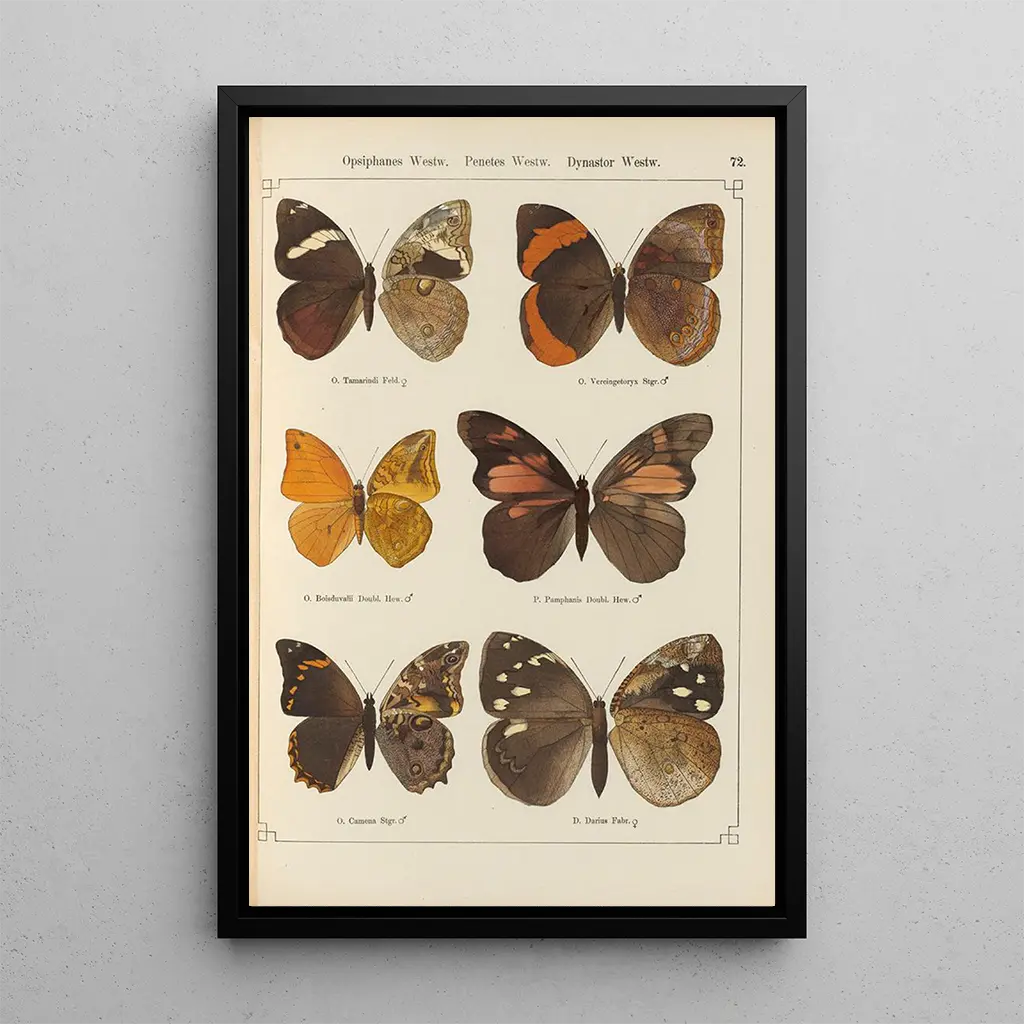 Otto Staudinger, figura emblemática del arte naturalista del siglo XIX, supo capturar la belleza de los insectos con una precisión notable. Su pasión por la naturaleza lo llevó a explorar regiones exóticas, donde pudo observar y estudiar la fauna local. Influenciado por las corrientes científicas de su época, Staudinger incorporó elementos de investigación en sus obras, haciendo de sus cuadros testimonios tanto artísticos como científicos. "Papillons exotiques Pl072" ilustra perfectamente su compromiso con la naturaleza y su deseo de sensibilizar al público sobre la riqueza de la biodiversidad.