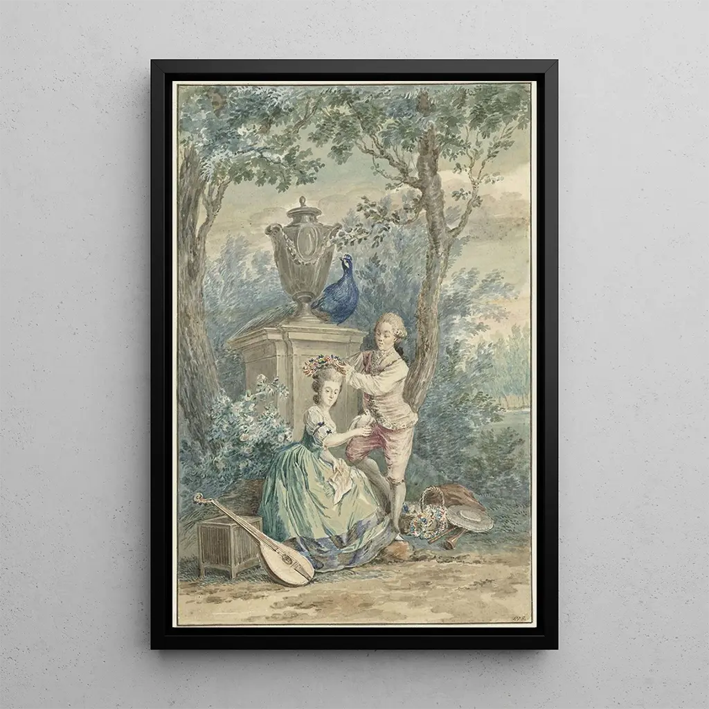 En esta impresión artística del cuadro "pareja elegante en un parque", Nicolaes Muys captura un momento de serenidad y elegancia. Los personajes, vestidos con trajes refinados, se encuentran en un parque exuberante, rodeados de vegetación y flores vibrantes. Los colores pastel, suaves y luminosos, crean una atmósfera romántica, mientras que la técnica de Muys, con sus pinceladas delicadas, da vida a cada detalle. La obra invita a una contemplación apacible, donde casi se puede escuchar el susurro del viento en los árboles y el canto de los pájaros.