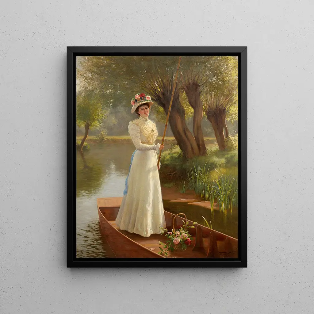 Promoción de barco en el Támesis - Frank Percy Wild – Introducción cautivadora En el fascinante universo del arte, algunas obras logran capturar la esencia misma de un momento, una emoción, un paisaje. "Promoción de barco en el Támesis - Frank Percy Wild" es una de esas creaciones que transportan al espectador al corazón de la belleza natural y de la tranquilidad de una tarde en el famoso río londinense. Esta obra, impregnada de serenidad, evoca tanto la dulzura de vivir como la armonía entre el hombre y la naturaleza. Al contemplar esta escena, casi se puede sentir el ligero movimiento de las aguas y la caricia de una brisa suave, una invitación a escapar del bullicio cotidiano para sumergirse en un mundo de gracia y poesía. Estilo y singularidad de la obra La obra de Frank Percy Wild se distingue por su uso magistral de la luz y el color. En "Promoción de barco en el Támesis", las delicadas tonalidades de azul y verde se mezclan para crear una atmósfera relajante, donde los reflejos de la luz en el agua parecen bailar bajo la influencia del viento. Los detalles minuciosos de los personajes, los árboles y los edificios que bordean el río reflejan una observación atenta del mundo natural. Wild logra dar vida a cada elemento de la composición, haciendo que la pintura sea a la vez viva e intemporal. Esta atención a los detalles, combinada con una paleta de colores armoniosa, confiere a la obra una profundidad emocional que resuena con quien la contempla. El artista y su influencia Frank Percy Wild, pintor británico del siglo XIX, supo imponerse como uno de los maestros de la pintura de paisaje. Influenciado por las grandes corrientes artísticas de su época, desarrolló un estilo único que combina realismo e impresionismo. Su pasión por la naturaleza y su deseo de capturar la belleza efímera de los paisajes lo llevaron a explorar diversos entornos, pero sin duda el Támesis fue especialmente inspirador para su trabajo. Al representar este río emblemático, Wild no se limita a describir un simple panorama; logra evocar recuerdos, sensaciones y una atmósfera que trasciende el tiempo. Su legado perdura, influyendo en muchos