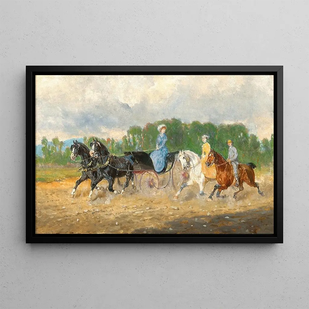 En "Paseo en coche", Alexander von Bensa nos transporta a una escena idílica donde la naturaleza y la humanidad coexisten armoniosamente. La composición, rica en detalles, destaca un paisaje verde, bañado por una luz suave. Los colores, que van desde verdes brillantes hasta tonos terrosos, crean una atmósfera tranquila y acogedora. La técnica del artista, que combina hábilmente el realismo con un toque impresionista, invita al espectador a sentir la serenidad de este momento suspendido. Cada elemento, desde el vehículo hasta los árboles majestuosos, parece contar una historia, la de una escapada en plena naturaleza.