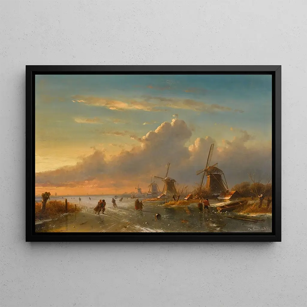 La impresión artística Patineurs au Coucher du Soleil de Charles Leickert captura un momento fugaz donde la luz dorada del atardecer se refleja en la superficie helada de una pista de hielo. Las siluetas de los patinadores, elegantemente dibujadas, se destacan sobre este fondo ardiente, creando una atmósfera a la vez dinámica y poética. Los colores cálidos y las sombras delicadas evocan una sensación de calidez humana, a pesar del frío invernal. Esta obra transporta al espectador a un mundo de alegría y convivialidad, donde el placer de patinar se convierte en una celebración de la belleza del invierno.