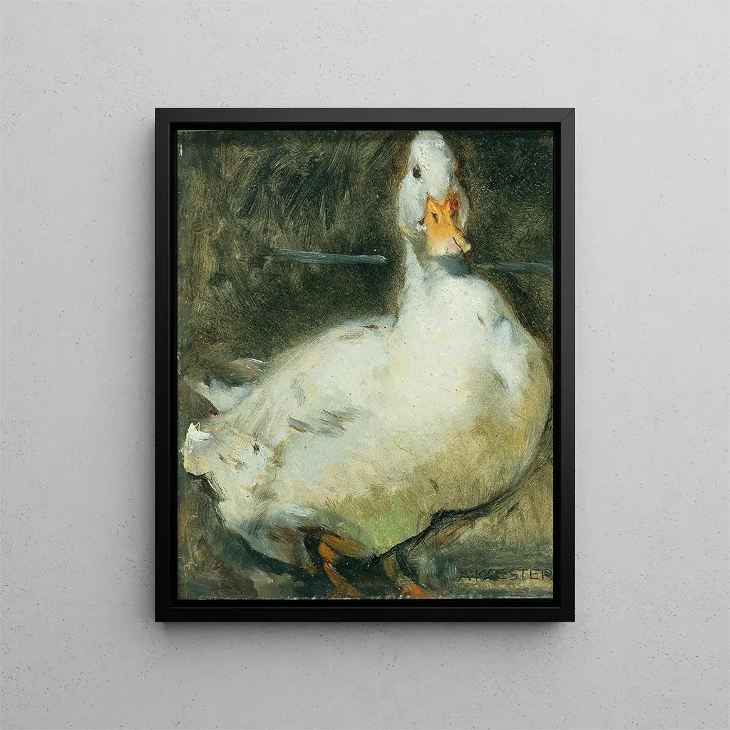 Reproducción Canard - Alexander Koester – Introducción cautivadora En el fascinante universo del arte animalista, "Canard" de Alexander Koester se distingue por su elegancia y delicadeza. Esta obra, que captura la belleza de un pato en un momento de serenidad, invita al espectador a sumergirse en un mundo donde la naturaleza y el arte se encuentran en una armonía rara. Koester, maestro en la representación animal, logra transmitir una emoción palpable a través de sus pinceladas, haciendo que cada detalle cobre vida. Al contemplar este cuadro, uno se transporta a un paisaje pacífico, donde el pato parece casi cobrar vida, ofreciendo una experiencia inmersiva que trasciende el simple acto de observar. Estilo y singularidad de la obra El estilo de Alexander Koester se caracteriza por una atención minuciosa a los detalles y una paleta de colores que evoca la suavidad de la naturaleza. En "Canard", las tonalidades de verde y azul se mezclan para crear un entorno acuático tranquilizador, mientras que el plumaje del pato brilla bajo la luz, revelando reflejos centelleantes. El artista sobresale en la representación de texturas, haciendo que el plumaje del pato sea increíblemente realista. Cada pluma parece haber sido pintada con cuidado, evidenciando la destreza técnica de Koester. La composición está equilibrada, con el pato ocupando un lugar central que atrae inmediatamente la mirada. Este cuadro no se limita a representar un animal; evoca una atmósfera de tranquilidad y belleza natural, haciendo de esta obra una verdadera oda a la fauna. El artista y su influencia Alexander Koester, nacido en 1864, es reconocido por su pasión por la naturaleza y su talento excepcional en la pintura animalista. Formado en la Academia de Bellas Artes de Düsseldorf, supo imponerse como uno de los artistas más influyentes de su época en este campo. Su fascinación por los animales, en particular las aves, se refleja en su obra, donde logra capturar no solo la apariencia física sino también la esencia misma de sus sujetos. Koester fue influenciado por artistas como Wilhelm Leibl y Franz von Stuck, pero supo desarrollar un estilo propio, combinando realismo y sensibilidad poética. Su trabajo ha inspirado a numerosos artistas contemporáneos, y su legado perdura en
