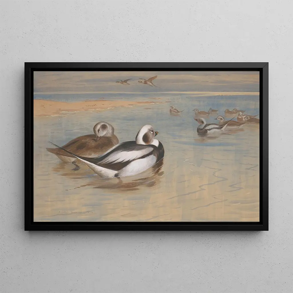 La impresión artística "Canards à longue queue" de Archibald Thorburn ilustra con delicadeza la belleza de la fauna acuática. Los canards, representados en su hábitat natural, se desplazan con gracia sobre el agua, mientras que los reflejos brillantes añaden una dimensión poética a la escena. Los colores suaves y los detalles minuciosos de las plumas revelan el talento de Thorburn para capturar la vida salvaje con una precisión notable. La atmósfera tranquila de esta obra invita a la contemplación, evocando la serenidad de una mañana junto a un estanque.