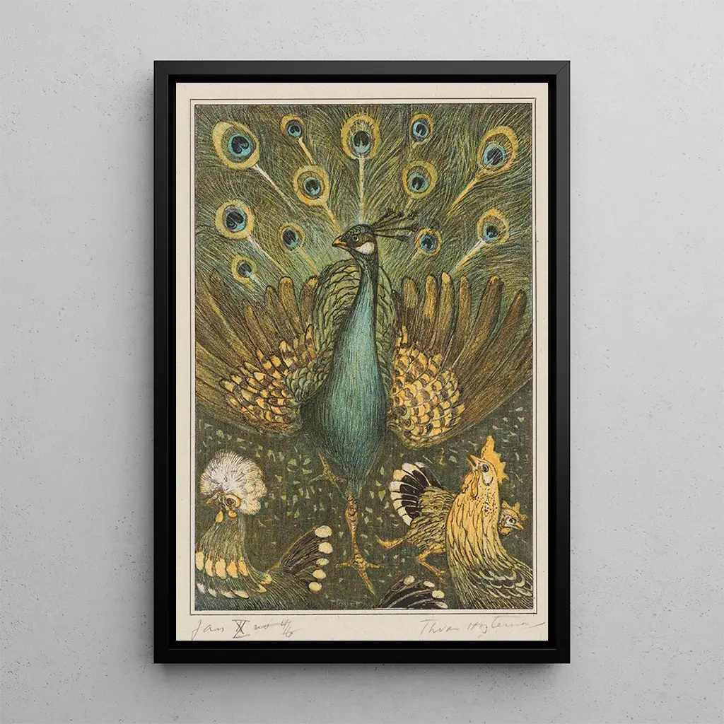 En esta obra vibrante, el paon despliega su majestuoso plumaje, rodeado de gallinas con tonos más discretos. La composición es un verdadero festival de colores, donde los verdes esmeralda y los azules profundos se entrelazan con toques de amarillo dorado. La técnica del artista, que combina acuarela y dibujo, crea una atmósfera ligera y aérea, casi onírica. Cada pluma del paon parece vibrar bajo la luz, mientras que las gallinas, más terrenales, aportan un toque de sencillez a esta escena exuberante. Este cuadro invita a la contemplación de la belleza natural y a la armonía de las formas.