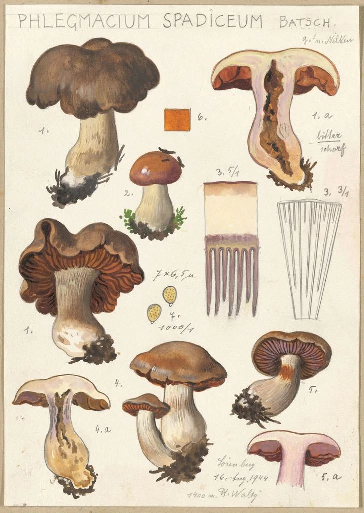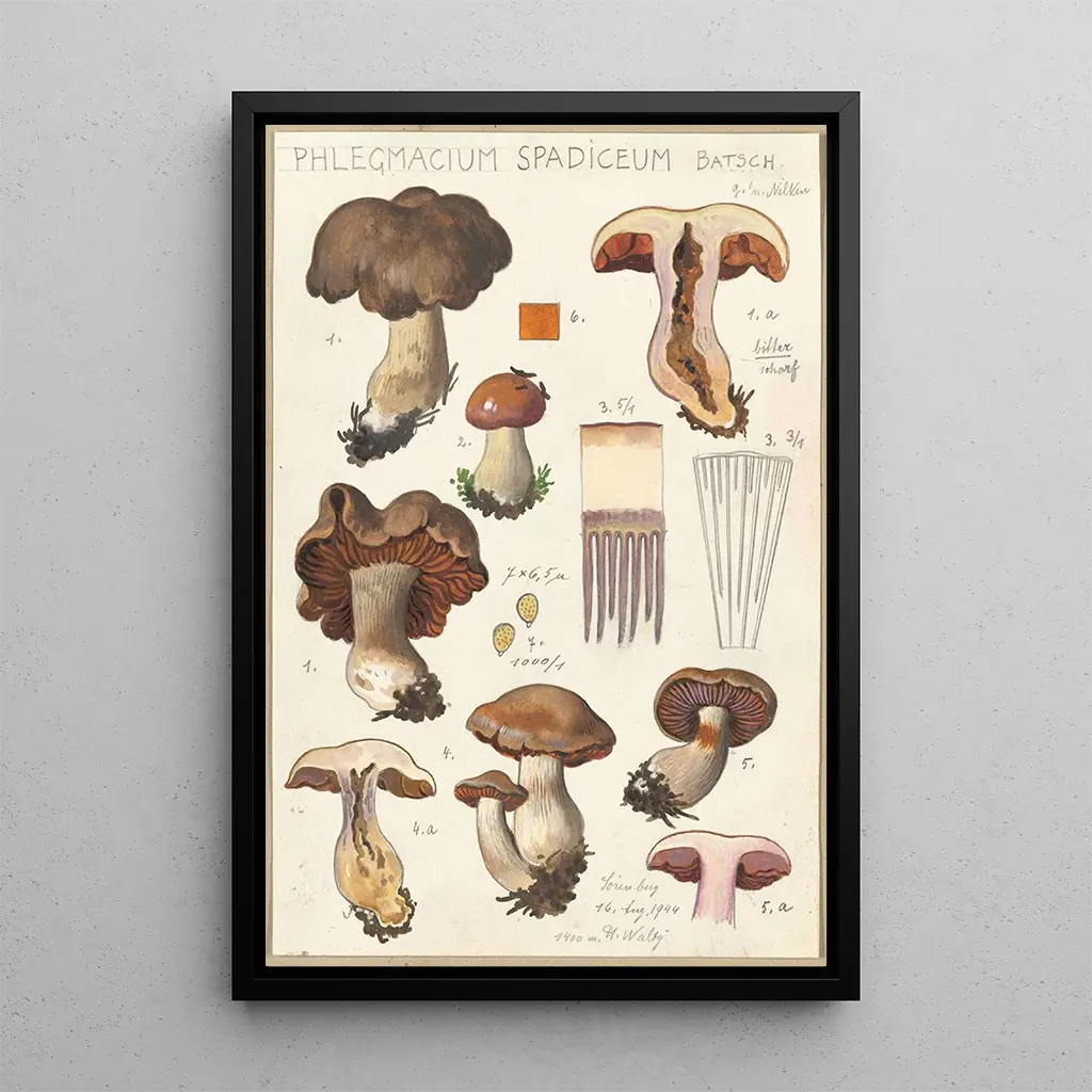 La impresión artística de Phlegmacium spadiceum Batsch revela un mundo fascinante de hongos con formas variadas y colores terrosos. Esta obra de Hans Baldung se distingue por su representación realista y detallada de los especímenes, ofreciendo una visión de la riqueza de la biodiversidad. Los tonos marrones y ocres, combinados con una técnica de pintura minuciosa, crean una atmósfera cálida y orgánica. Cada hongo parece cobrar vida, invitando al espectador a explorar los misterios de la naturaleza y a apreciar su belleza oculta.