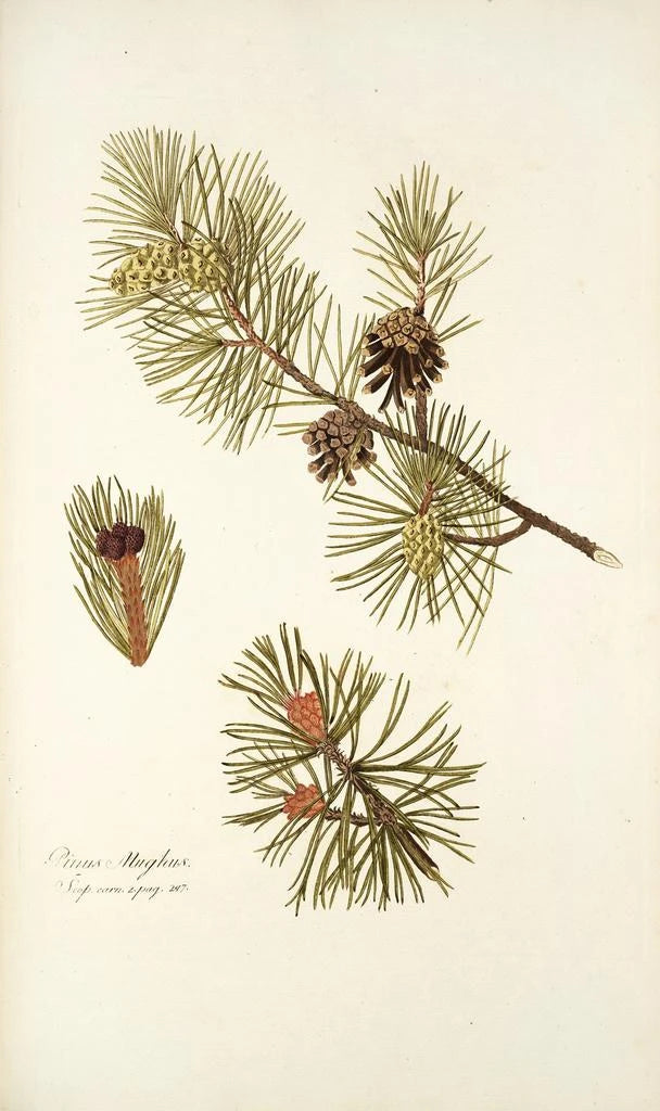 Nikolaus Joseph Freiherr von Jacquin, figura emblemática del siglo XVIII, supo combinar su amor por la botánica con su talento artístico. Sus exploraciones le llevaron a descubrir y documentar numerosas especies vegetales, incluido el Pinus mughus. Influenciado por las corrientes científicas de su tiempo, contribuyó a la comprensión de las plantas a través de sus ilustraciones. Su obra, rica en detalles y colores, refleja una época en la que el arte y la ciencia se unían para celebrar la belleza de la naturaleza y enriquecer el conocimiento botánico.