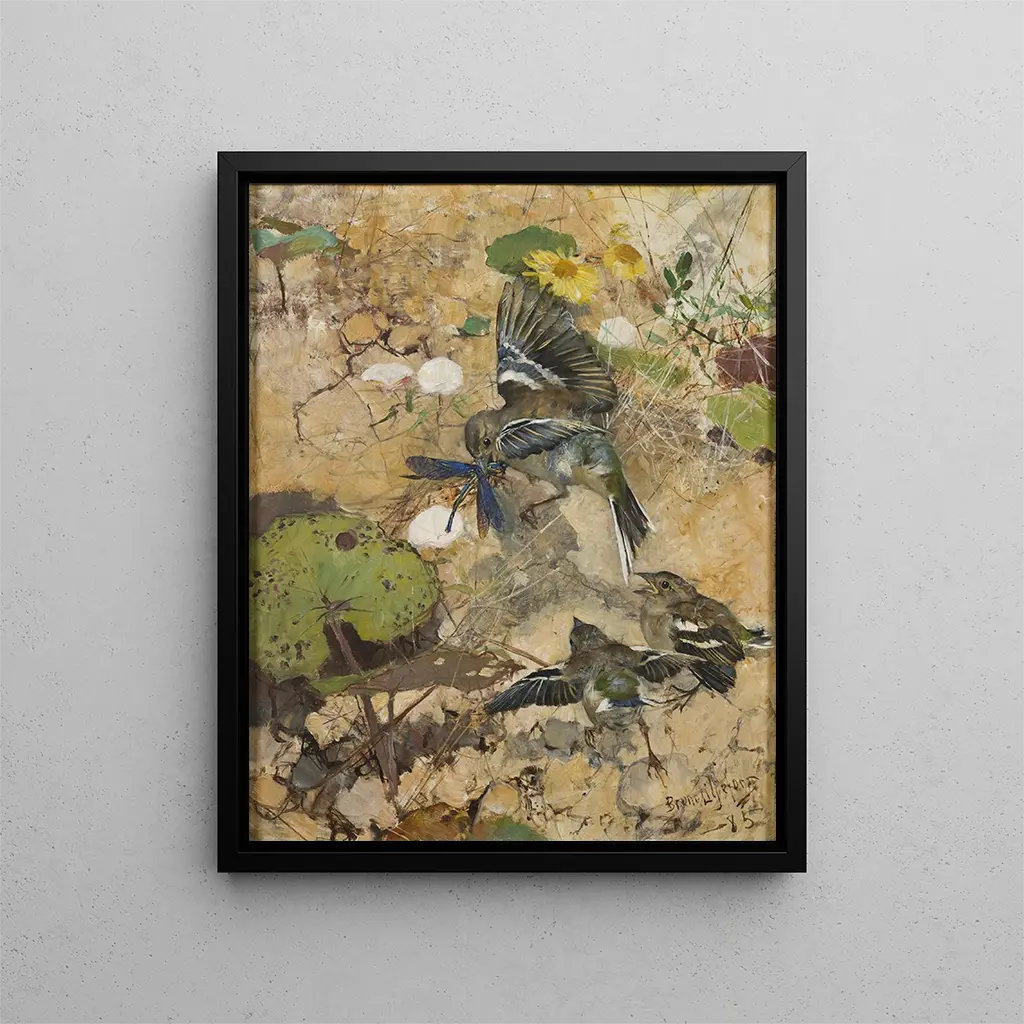 Bruno Liljefors, maestro indiscutible del arte animalista, logra capturar no solo la apariencia de los seres vivos, sino también su esencia misma. En "Pinzones de los árboles y libélulas", utiliza colores vibrantes y juegos de luz sutiles para crear una atmósfera a la vez pacífica y dinámica. Las tonalidades de verde y azul se mezclan armoniosamente, evocando la frescura de una mañana primaveral. Los detalles minuciosos de las plumas de los pájaros y de las alas de las libélulas reflejan una observación atenta y una técnica dominada. Cada elemento de la composición está cuidadosamente dispuesto, permitiendo que la vista se pasee por el cuadro y aprecie su riqueza. Este estilo único, a la vez realista y poético, hace de esta obra una pieza maestra que no dejará de despertar la admiración de los amantes del arte.