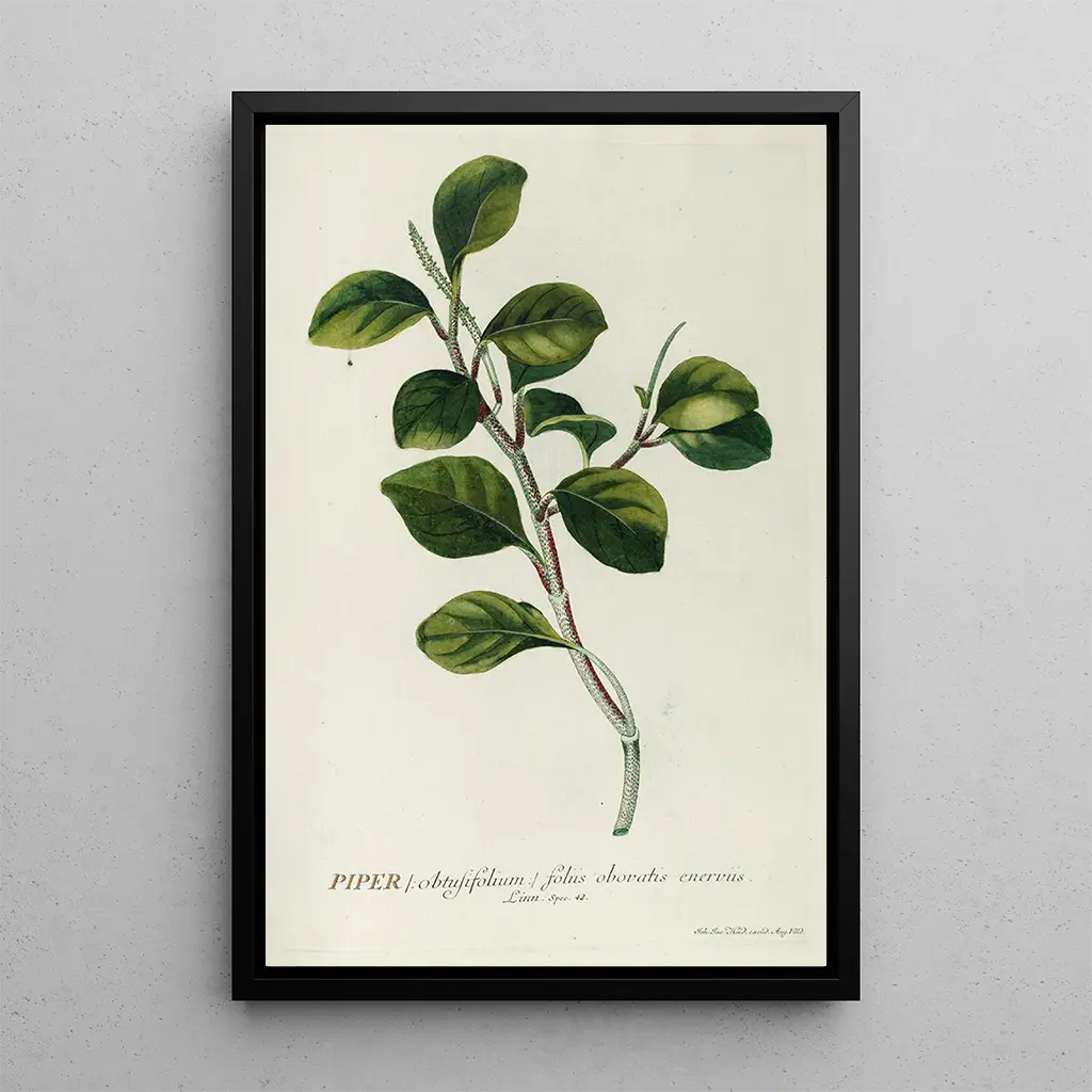 La impresión artística de Piper, obra emblemática de Georg Dionysius Ehret, nos sumerge en un universo botánico fascinante. Los detalles minuciosos de las hojas y las tallas se combinan con una paleta de verdes vibrantes, creando una atmósfera a la vez relajante y dinámica. La técnica de la impresión artística en cobre, utilizada por el artista, permite capturar la delicadeza de las texturas naturales, mientras que la luz parece jugar sobre las superficies, dando vida a esta composición. Cada elemento de este lienzo invita a la observación, a la contemplación de las maravillas de la naturaleza, como si se pudiera casi sentir el aroma de las plantas.